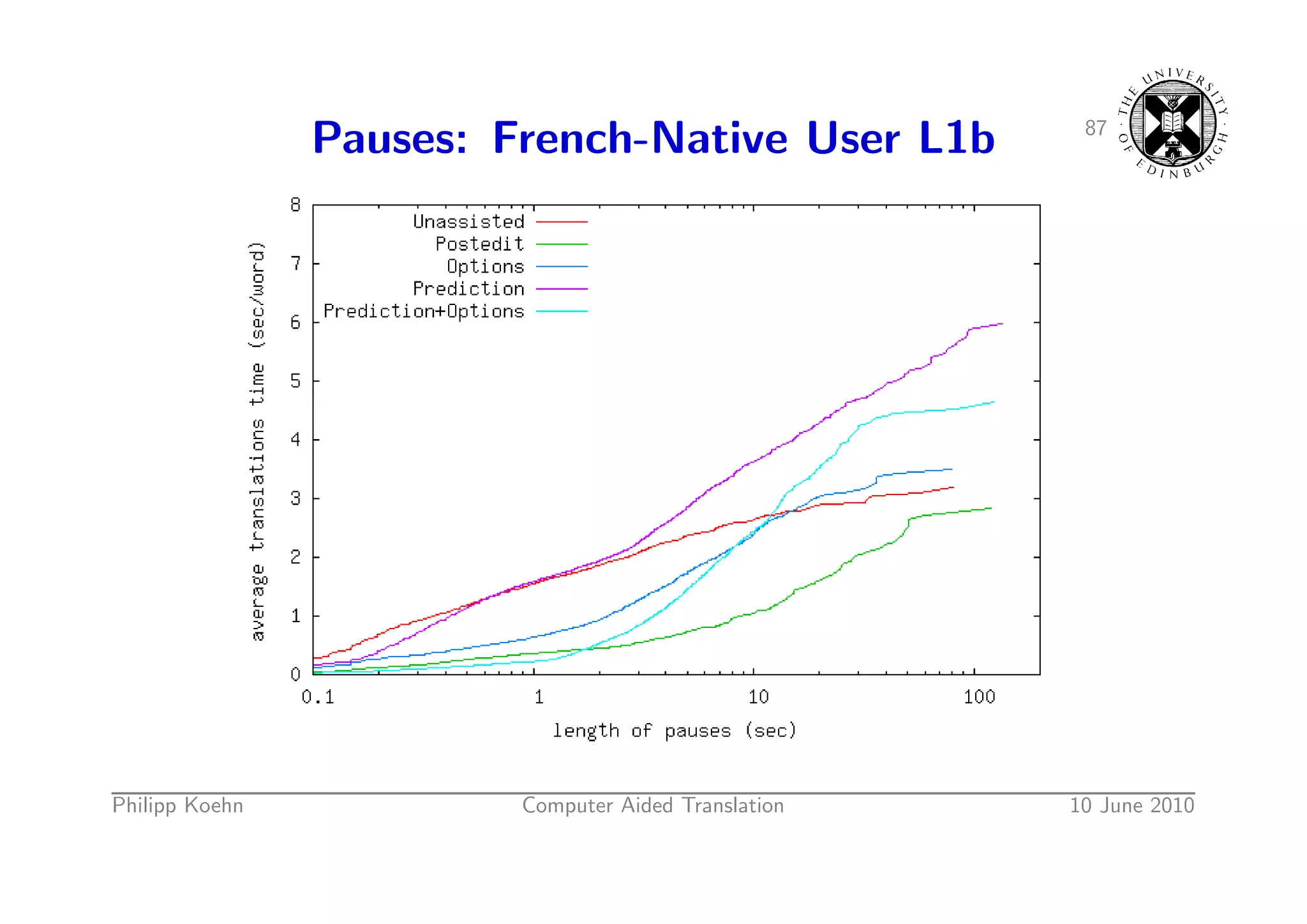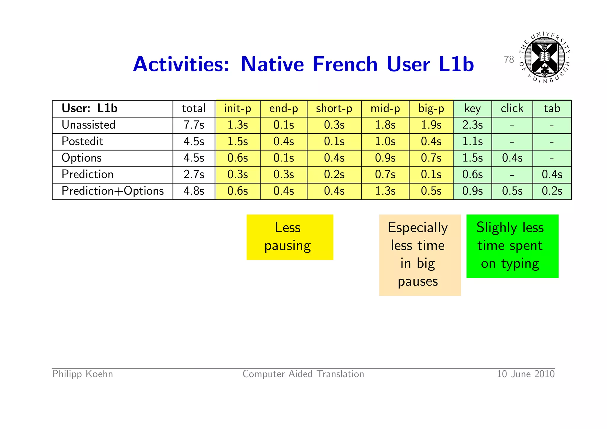 111. 111. 77 Activities: Native French User L1b User: L1b total init-p end-p short-p mid-p big-p key click tab Unassisted 7.7s 1.3s 0.1s 0.3s 1.8s 1.9s 2.3s - - Postedit 4.5s 1.5s 0.4s 0.1s 1.0s 0.4s 1.1s - - Options 4.5s 0.6s 0.1s 0.4s 0.9s 0.7s 1.5s 0.4s - Prediction 2.7s 0.3s 0.3s 0.2s 0.7s 0.1s 0.6s - 0.4s Prediction+Options 4.8s 0.6s 0.4s 0.4s 1.3s 0.5s 0.9s 0.5s 0.2s Less Slighly less pausing time spent on typing Philipp Koehn Computer Aided Translation 10 June 2010
