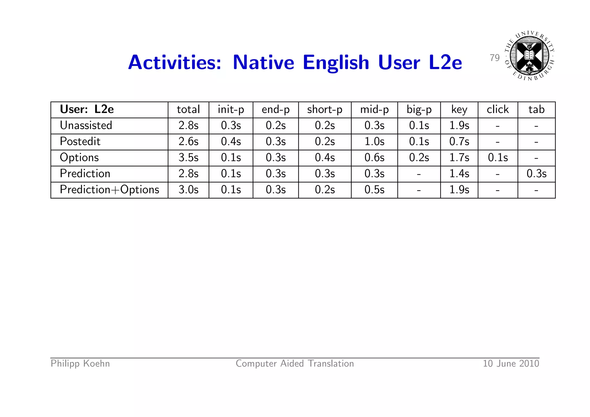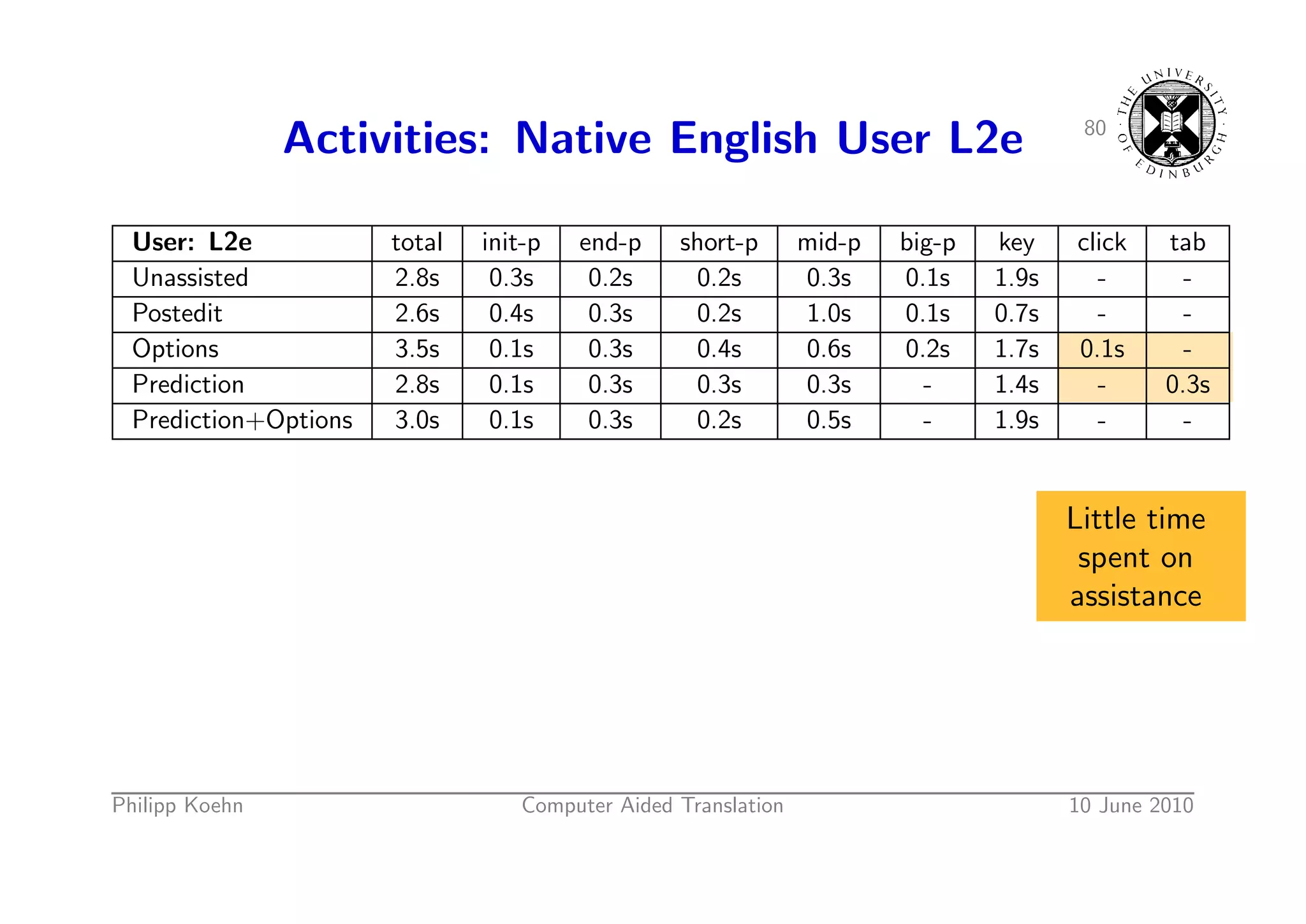 113. 113. 79 Activities: Native English User L2e User: L2e total init-p end-p short-p mid-p big-p key click tab Unassisted 2.8s 0.3s 0.2s 0.2s 0.3s 0.1s 1.9s - - Postedit 2.6s 0.4s 0.3s 0.2s 1.0s 0.1s 0.7s - - Options 3.5s 0.1s 0.3s 0.4s 0.6s 0.2s 1.7s 0.1s - Prediction 2.8s 0.1s 0.3s 0.3s 0.3s - 1.4s - 0.3s Prediction+Options 3.0s 0.1s 0.3s 0.2s 0.5s - 1.9s - - Philipp Koehn Computer Aided Translation 10 June 2010