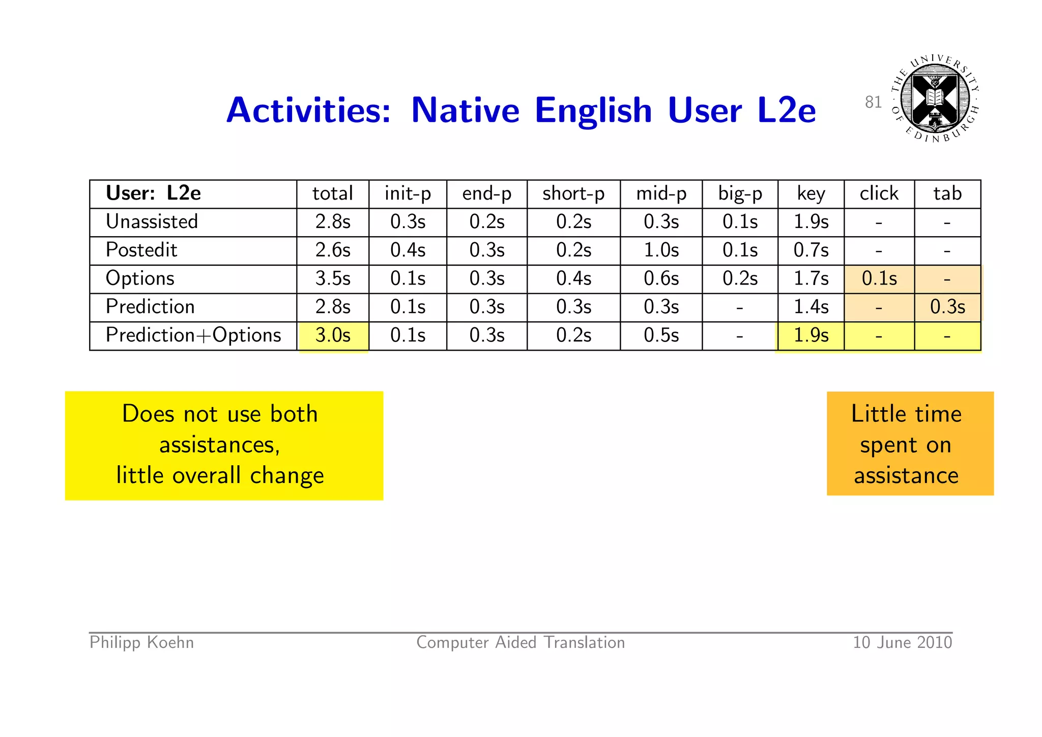 114. 114. 80 Activities: Native English User L2e User: L2e total init-p end-p short-p mid-p big-p key click tab Unassisted 2.8s 0.3s 0.2s 0.2s 0.3s 0.1s 1.9s - - Postedit 2.6s 0.4s 0.3s 0.2s 1.0s 0.1s 0.7s - - Options 3.5s 0.1s 0.3s 0.4s 0.6s 0.2s 1.7s 0.1s - Prediction 2.8s 0.1s 0.3s 0.3s 0.3s - 1.4s - 0.3s Prediction+Options 3.0s 0.1s 0.3s 0.2s 0.5s - 1.9s - - Little time spent on assistance Philipp Koehn Computer Aided Translation 10 June 2010