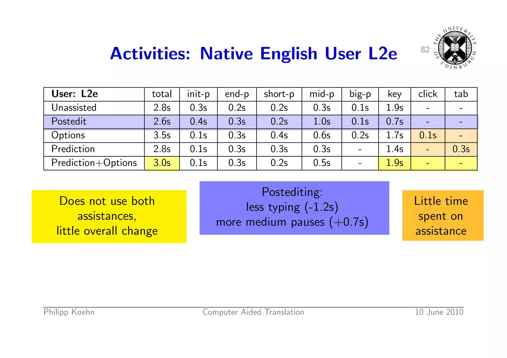 115. 115. 81 Activities: Native English User L2e User: L2e total init-p end-p short-p mid-p big-p key click tab Unassisted 2.8s 0.3s 0.2s 0.2s 0.3s 0.1s 1.9s - - Postedit 2.6s 0.4s 0.3s 0.2s 1.0s 0.1s 0.7s - - Options 3.5s 0.1s 0.3s 0.4s 0.6s 0.2s 1.7s 0.1s - Prediction 2.8s 0.1s 0.3s 0.3s 0.3s - 1.4s - 0.3s Prediction+Options 3.0s 0.1s 0.3s 0.2s 0.5s - 1.9s - - Does not use both Little time assistances, spent on little overall change assistance Philipp Koehn Computer Aided Translation 10 June 2010