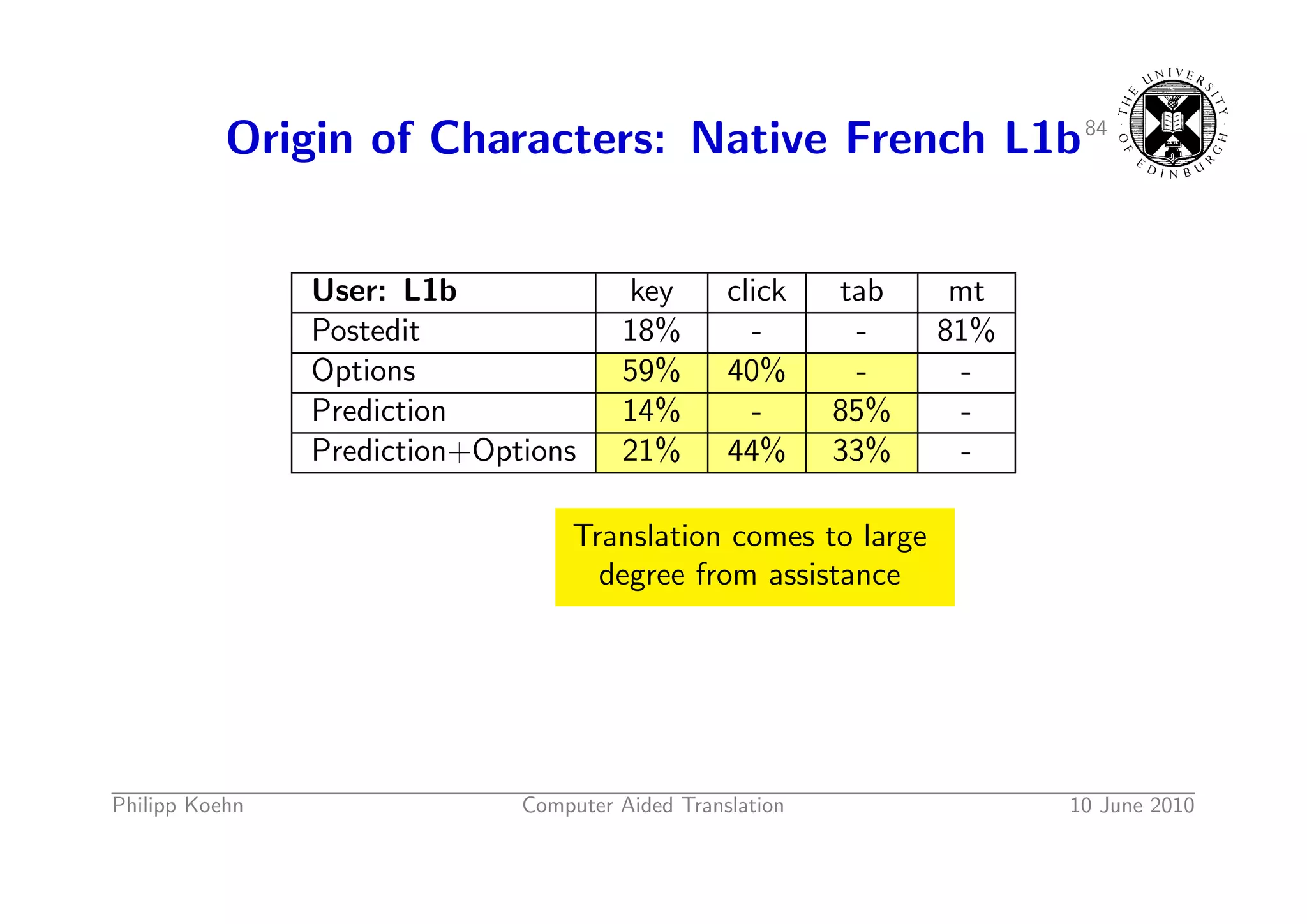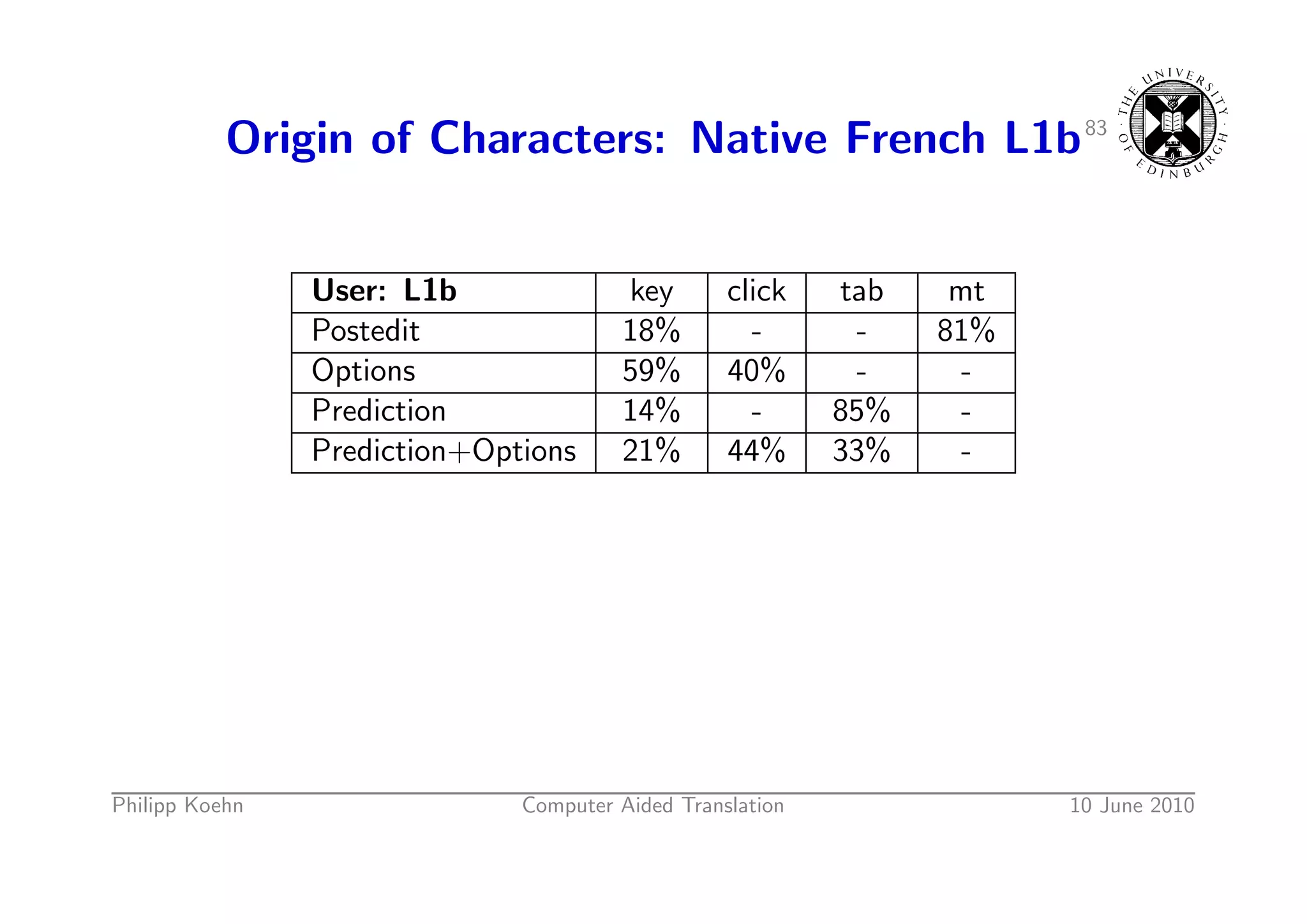 117. 117. Origin of Characters: Native French L1b 83 User: L1b key click tab mt Postedit 18% - - 81% Options 59% 40% - - Prediction 14% - 85% - Prediction+Options 21% 44% 33% - Philipp Koehn Computer Aided Translation 10 June 2010