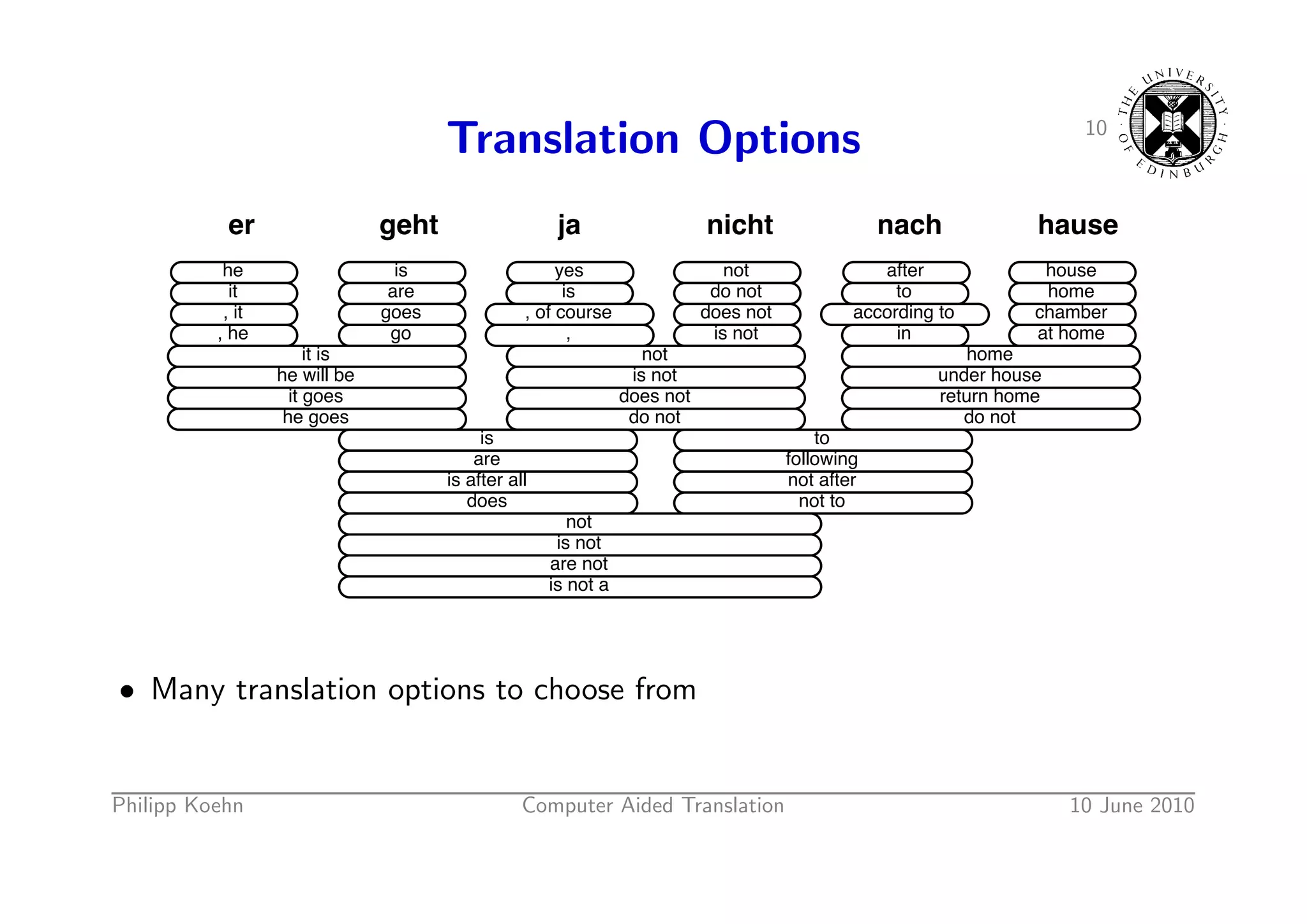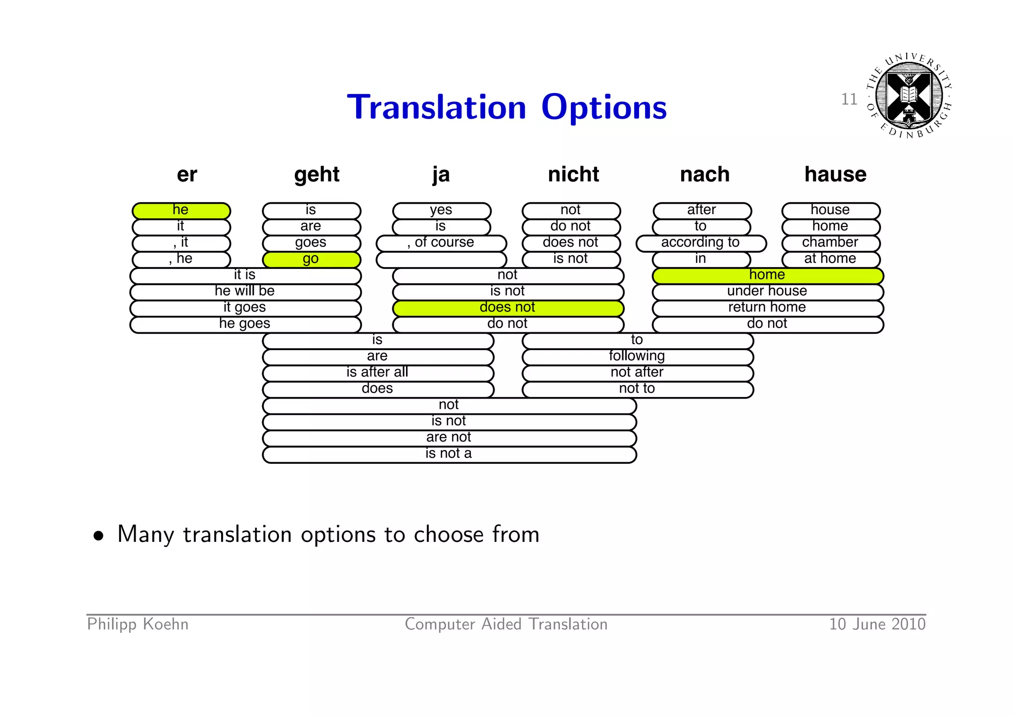 13. 13. 11 Translation Options er geht ja nicht nach hause he is yes not after house it are is do not to home , it goes , of course does not according to chamber , he go is not in at home it is not home he will be is not under house it goes does not return home he goes do not do not is to are following is after all not after does not to not is not are not is not a • Many translation options to choose from Philipp Koehn Computer Aided Translation 10 June 2010