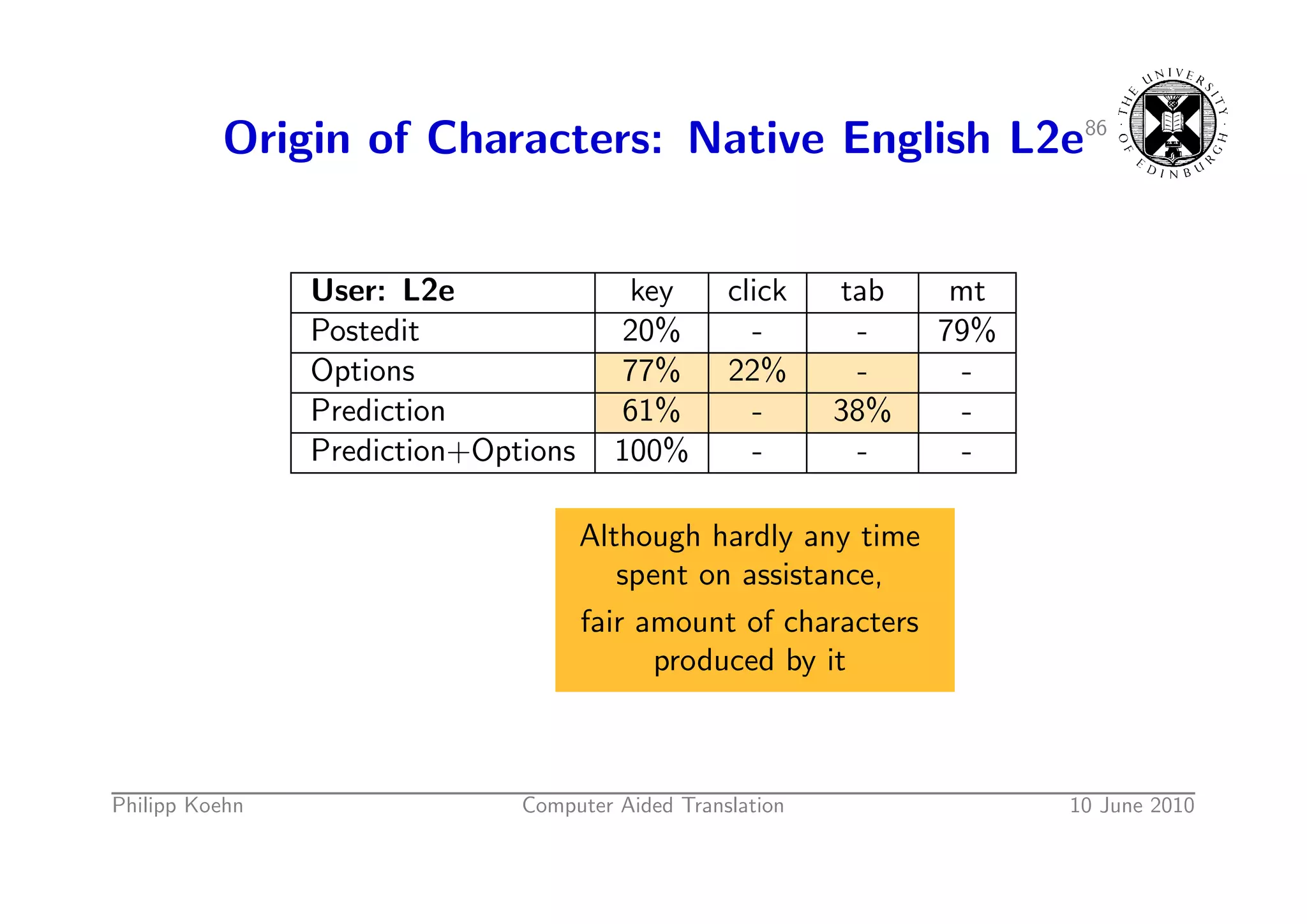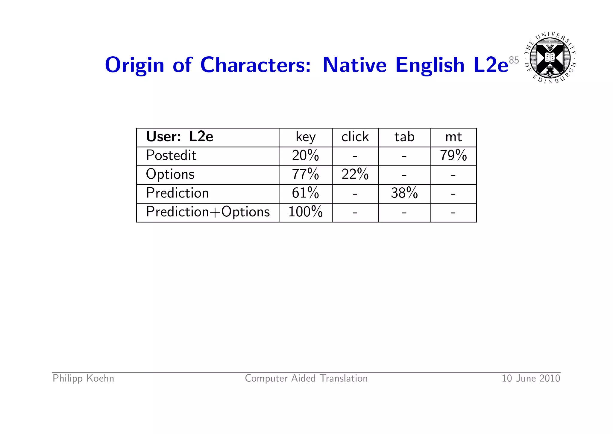 119. 119. Origin of Characters: Native English L2e85 User: L2e key click tab mt Postedit 20% - - 79% Options 77% 22% - - Prediction 61% - 38% - Prediction+Options 100% - - - Philipp Koehn Computer Aided Translation 10 June 2010