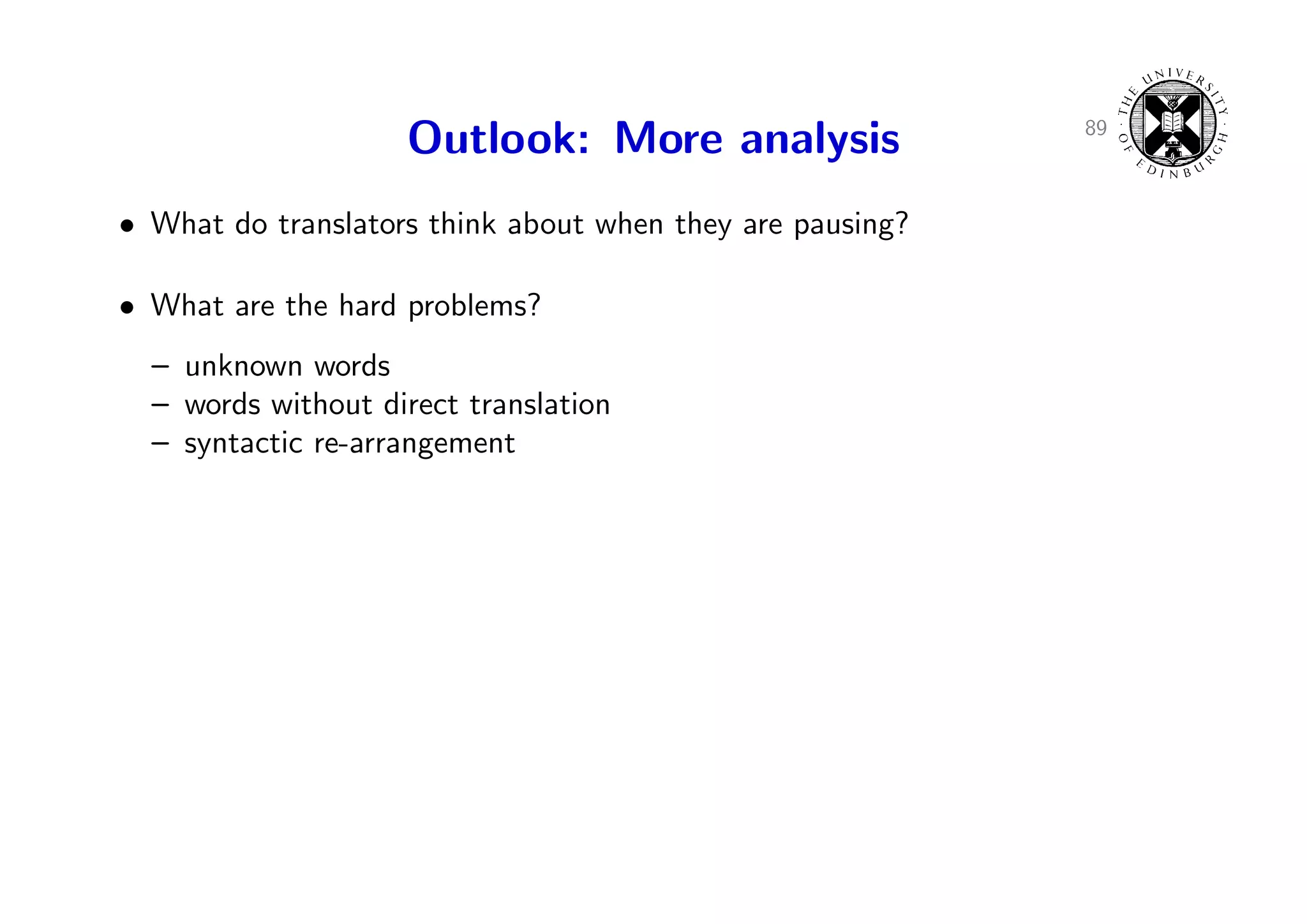124. 124. 89 Outlook: More analysis • What do translators think about when they are pausing? • What are the hard problems? – unknown words – words without direct translation – syntactic re-arrangement