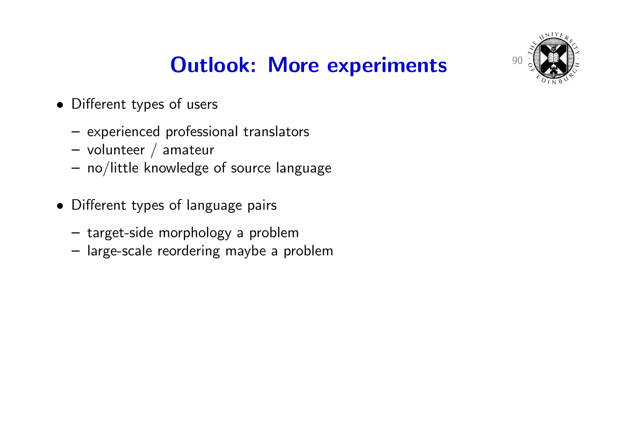 127. 127. 90 Outlook: More experiments • Different types of users – experienced professional translators – volunteer / amateur – no/little knowledge of source language • Different types of language pairs – target-side morphology a problem – large-scale reordering maybe a problem