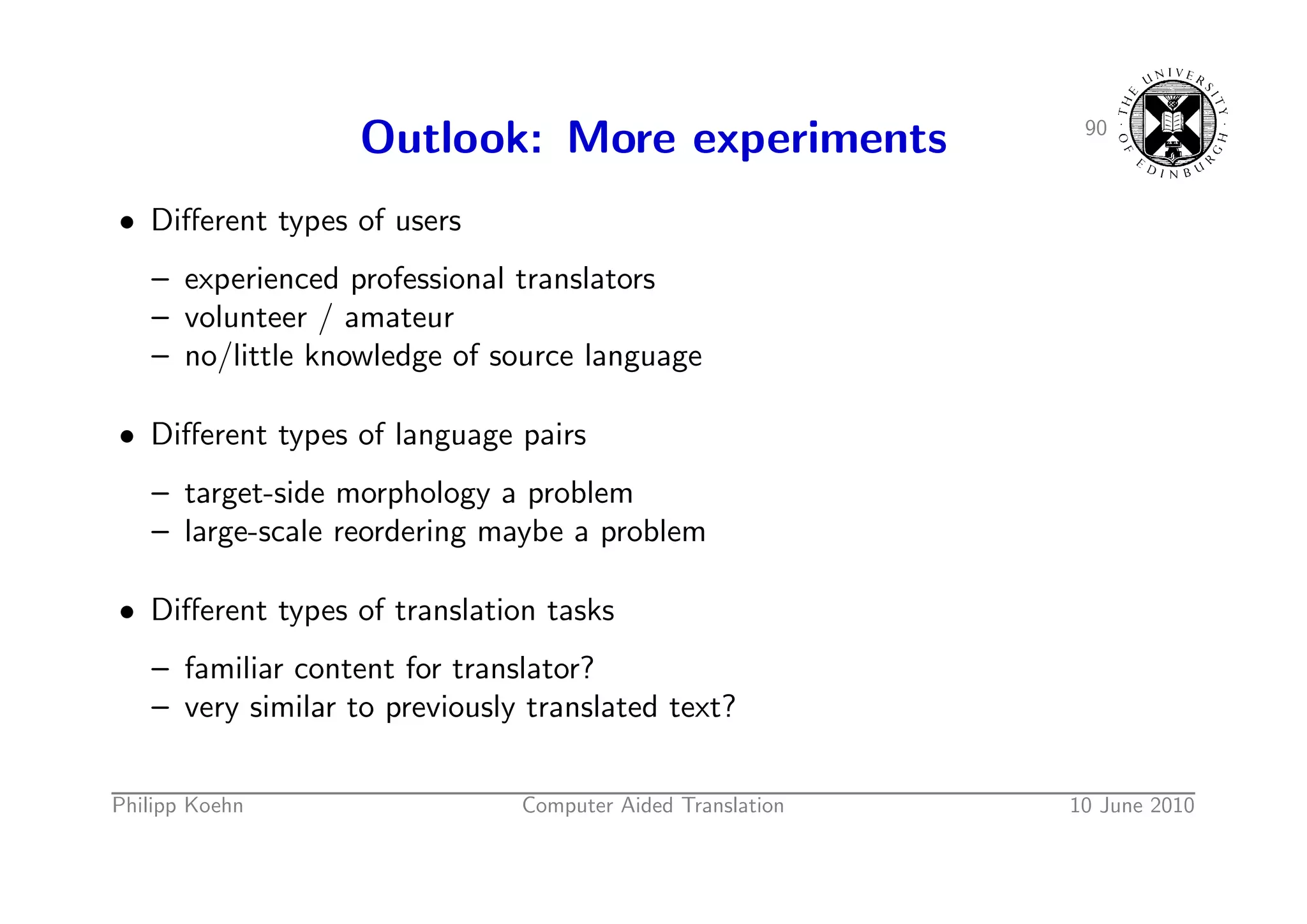 129. 129. 90 Outlook: More experiments • Different types of users – experienced professional translators – volunteer / amateur – no/little knowledge of source language • Different types of language pairs – target-side morphology a problem – large-scale reordering maybe a problem • Different types of translation tasks – familiar content for translator? – very similar to previously translated text? Philipp Koehn Computer Aided Translation 10 June 2010