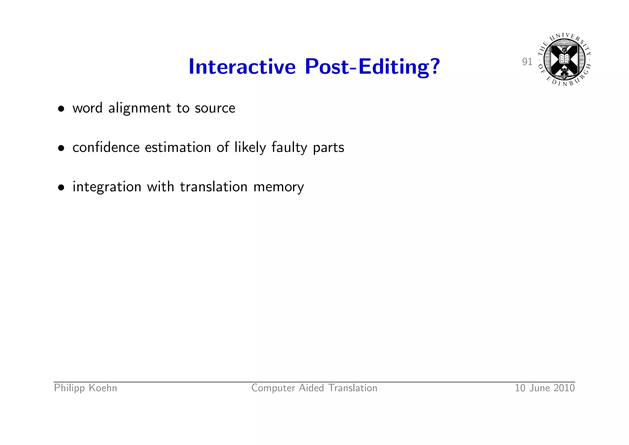 130. 130. 91 Interactive Post-Editing? • word alignment to source • confidence estimation of likely faulty parts • integration with translation memory Philipp Koehn Computer Aided Translation 10 June 2010