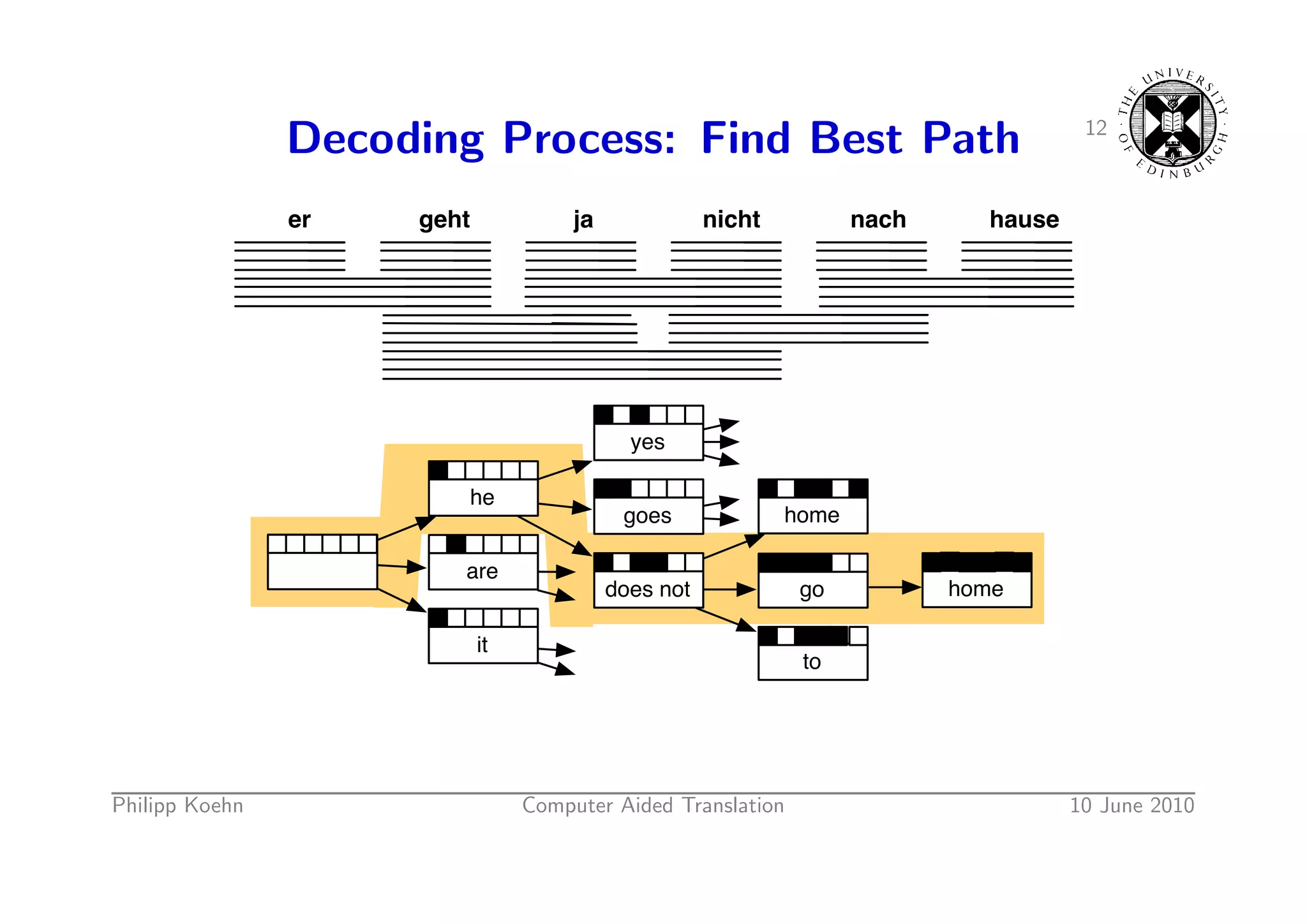 14. 14. 12 Decoding Process: Find Best Path er geht ja nicht nach hause yes he goes home are does not go home it to Philipp Koehn Computer Aided Translation 10 June 2010