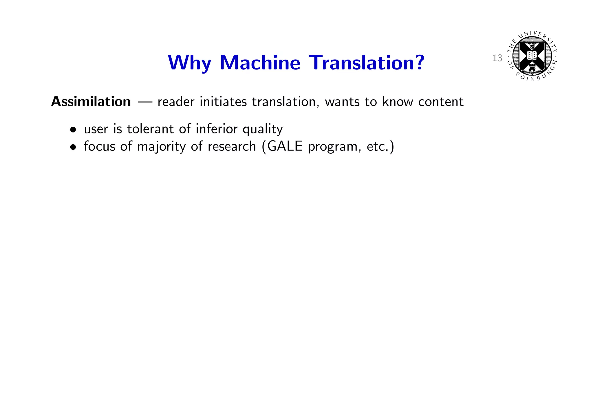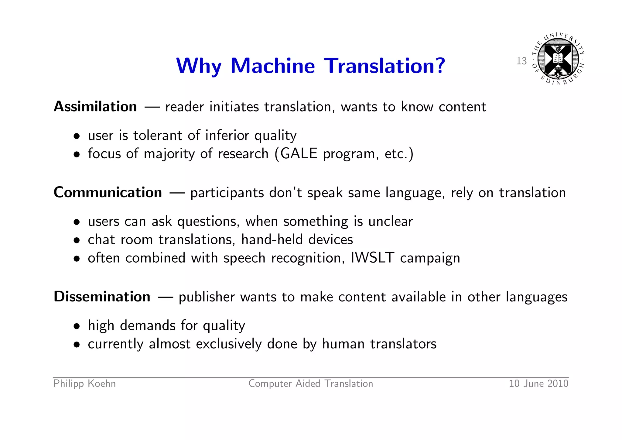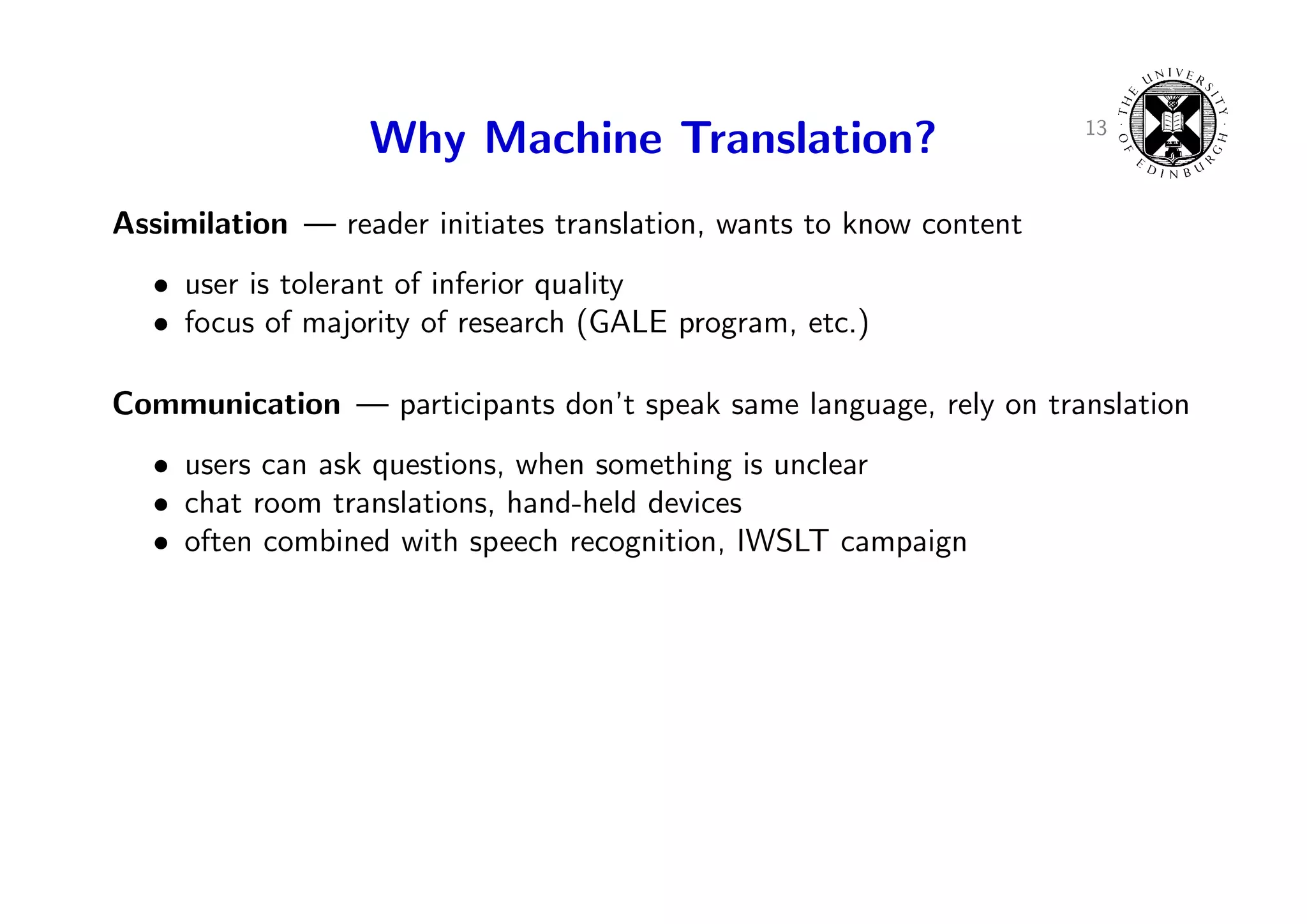 16. 16. 13 Why Machine Translation? Assimilation — reader initiates translation, wants to know content • user is tolerant of inferior quality • focus of majority of research (GALE program, etc.) Communication — participants don’t speak same language, rely on translation • users can ask questions, when something is unclear • chat room translations, hand-held devices • often combined with speech recognition, IWSLT campaign