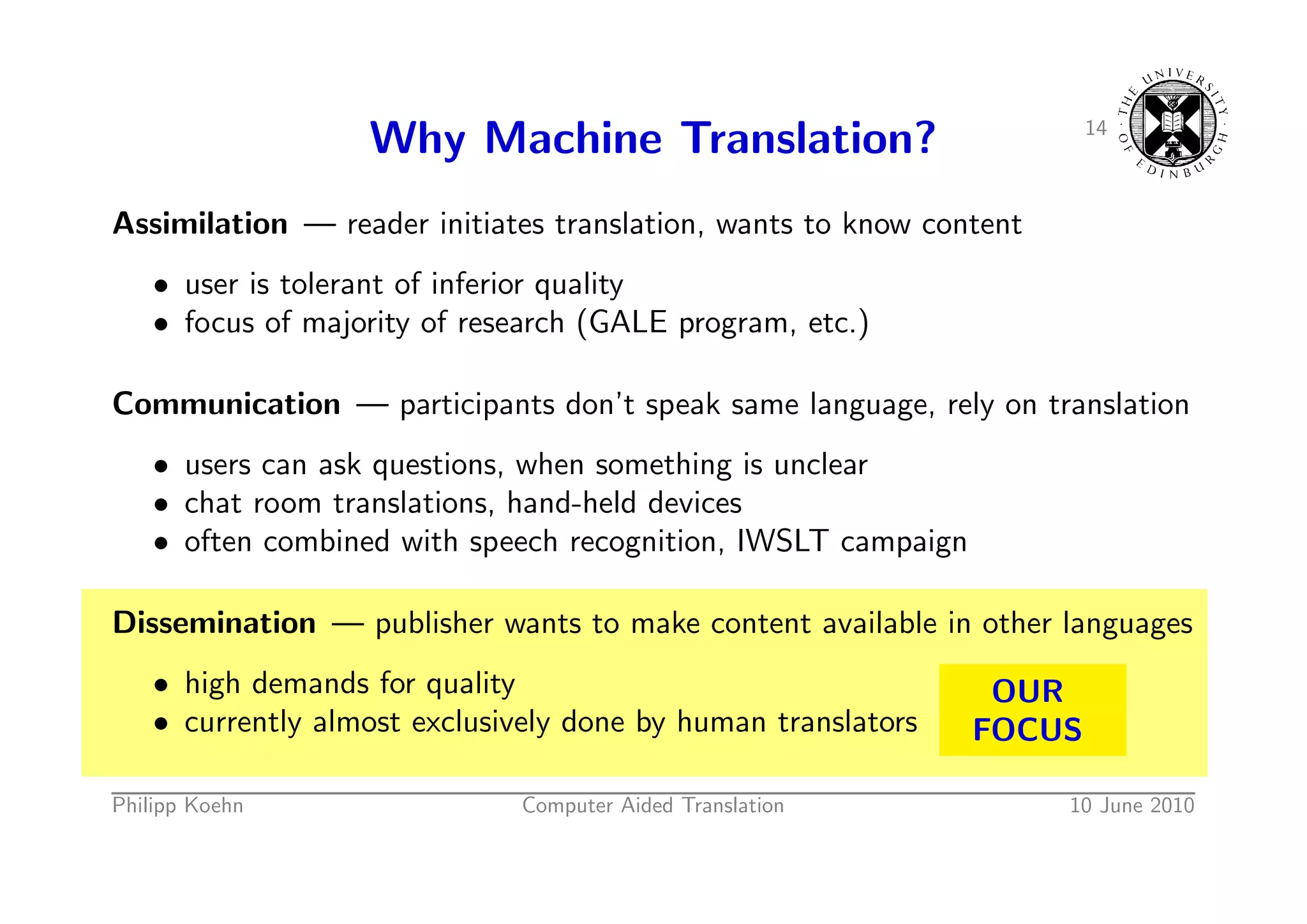 18. 18. 14 Why Machine Translation? Assimilation — reader initiates translation, wants to know content • user is tolerant of inferior quality • focus of majority of research (GALE program, etc.) Communication — participants don’t speak same language, rely on translation • users can ask questions, when something is unclear • chat room translations, hand-held devices • often combined with speech recognition, IWSLT campaign Dissemination — publisher wants to make content available in other languages • high demands for quality OUR • currently almost exclusively done by human translators FOCUS Philipp Koehn Computer Aided Translation 10 June 2010