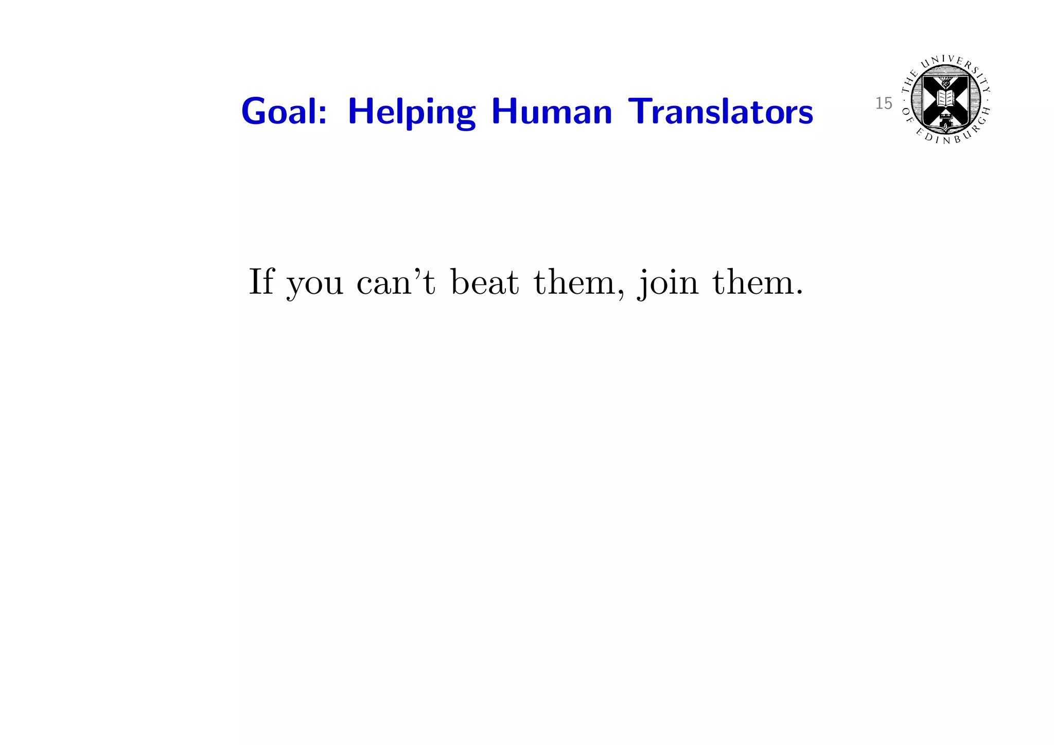 19. 19. 15 Goal: Helping Human Translators If you can’t beat them, join them.