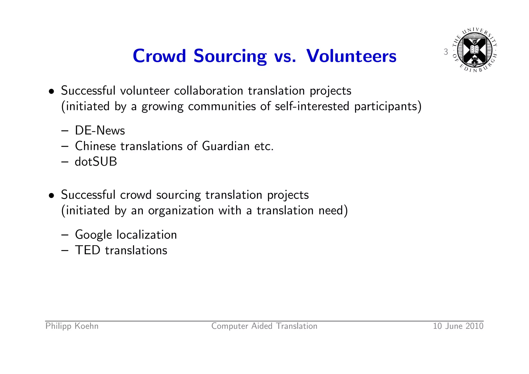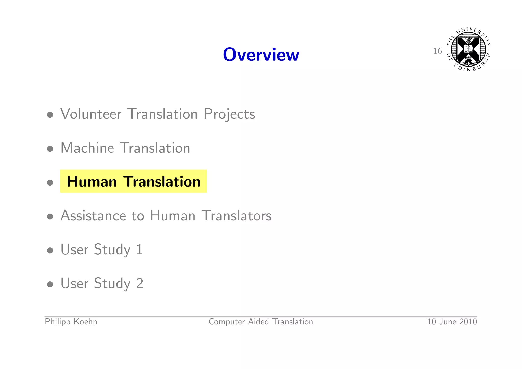 2. 2. 1 Overview • Volunteer Translation Projects • Machine Translation • Human Translation • Assistance to Human Translators • User Study 1 • User Study 2 Philipp Koehn Computer Aided Translation 10 June 2010