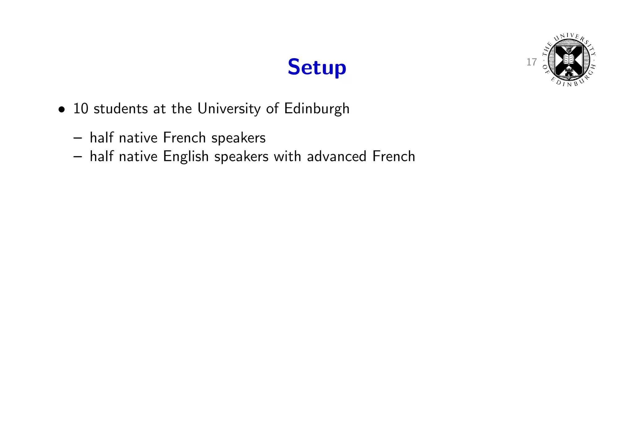 23. 23. 17 Setup • 10 students at the University of Edinburgh – half native French speakers – half native English speakers with advanced French