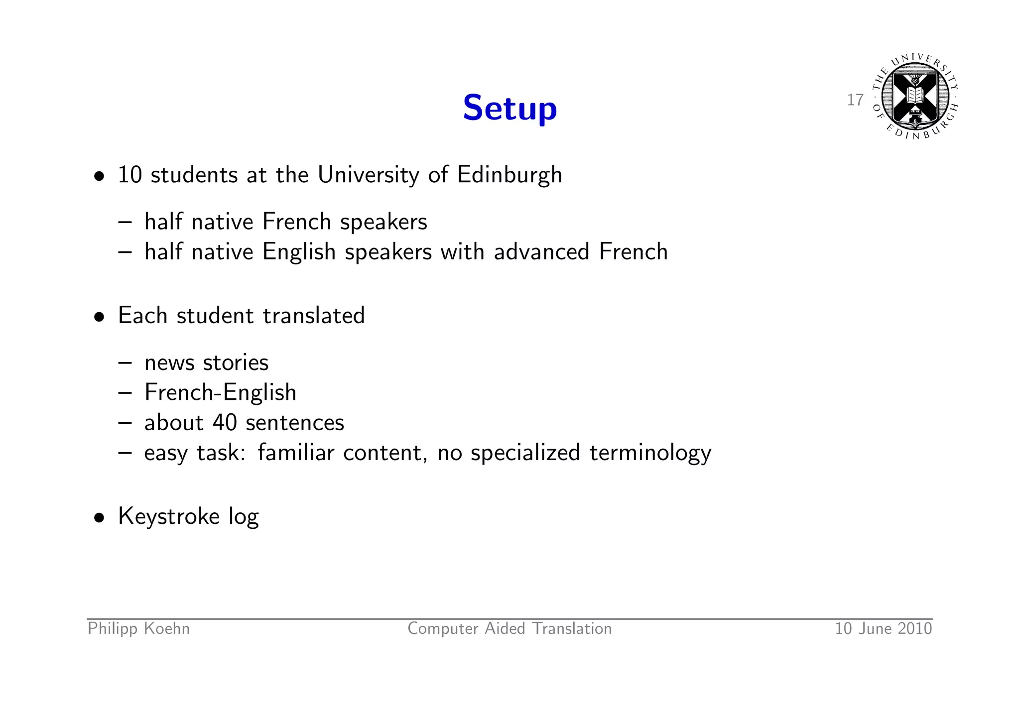 24. 24. 17 Setup • 10 students at the University of Edinburgh – half native French speakers – half native English speakers with advanced French • Each student translated – news stories – French-English – about 40 sentences – easy task: familiar content, no specialized terminology • Keystroke log Philipp Koehn Computer Aided Translation 10 June 2010