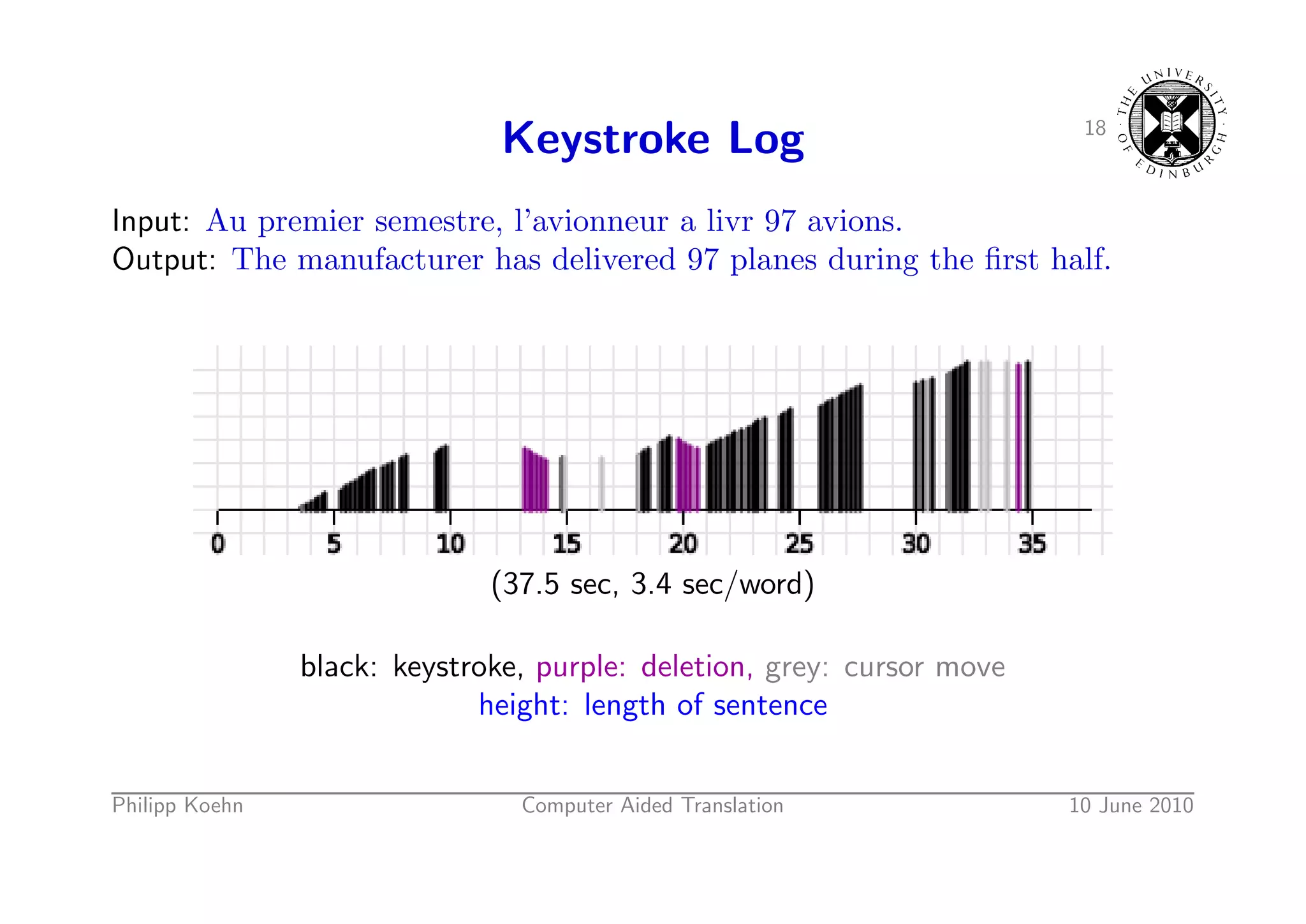 25. 25. 18 Keystroke Log Input: Au premier semestre, l’avionneur a livr 97 avions. Output: The manufacturer has delivered 97 planes during the first half. (37.5 sec, 3.4 sec/word) black: keystroke, purple: deletion, grey: cursor move height: length of sentence Philipp Koehn Computer Aided Translation 10 June 2010