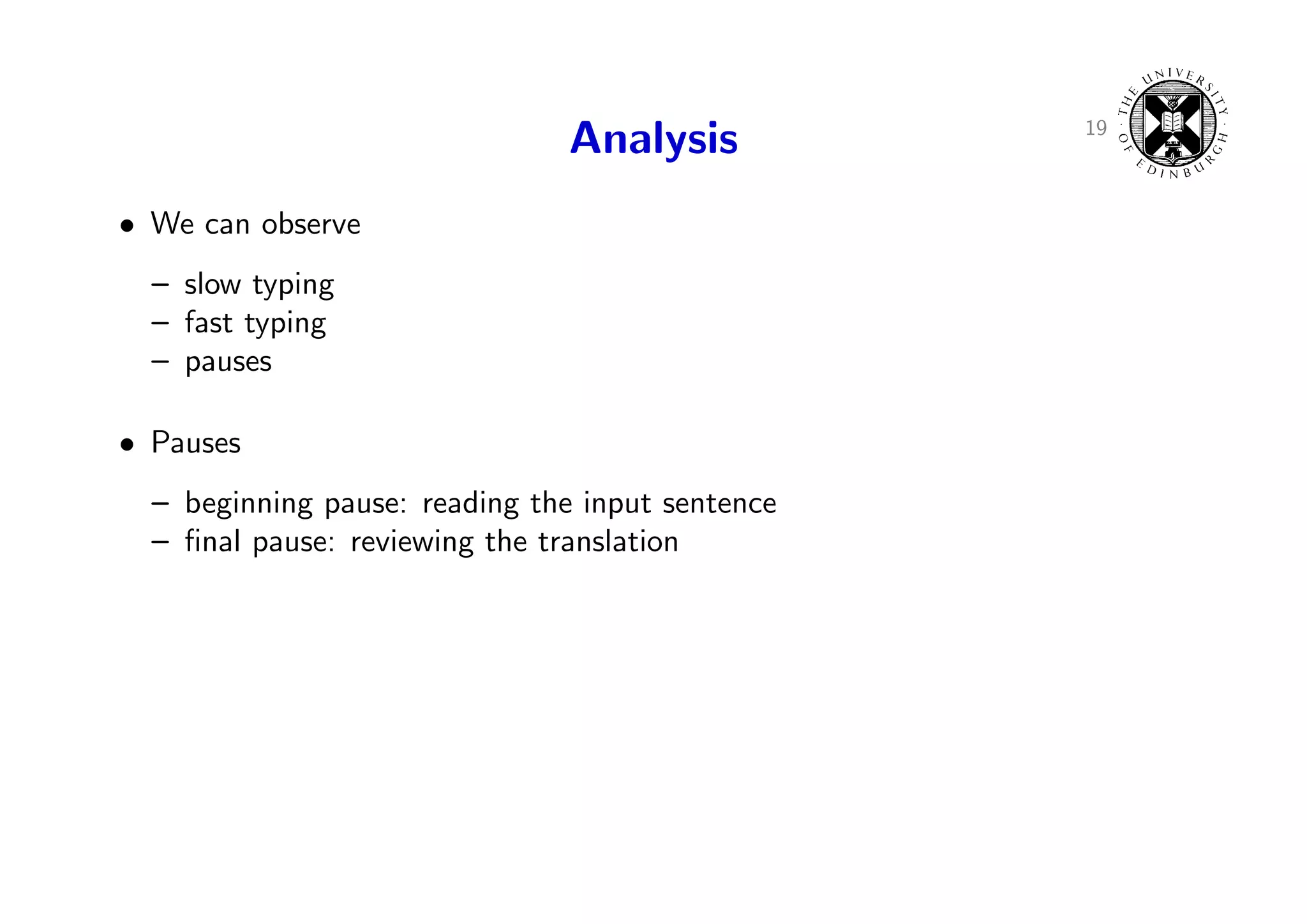 29. 29. 19 Analysis • We can observe – slow typing – fast typing – pauses • Pauses – beginning pause: reading the input sentence – final pause: reviewing the translation