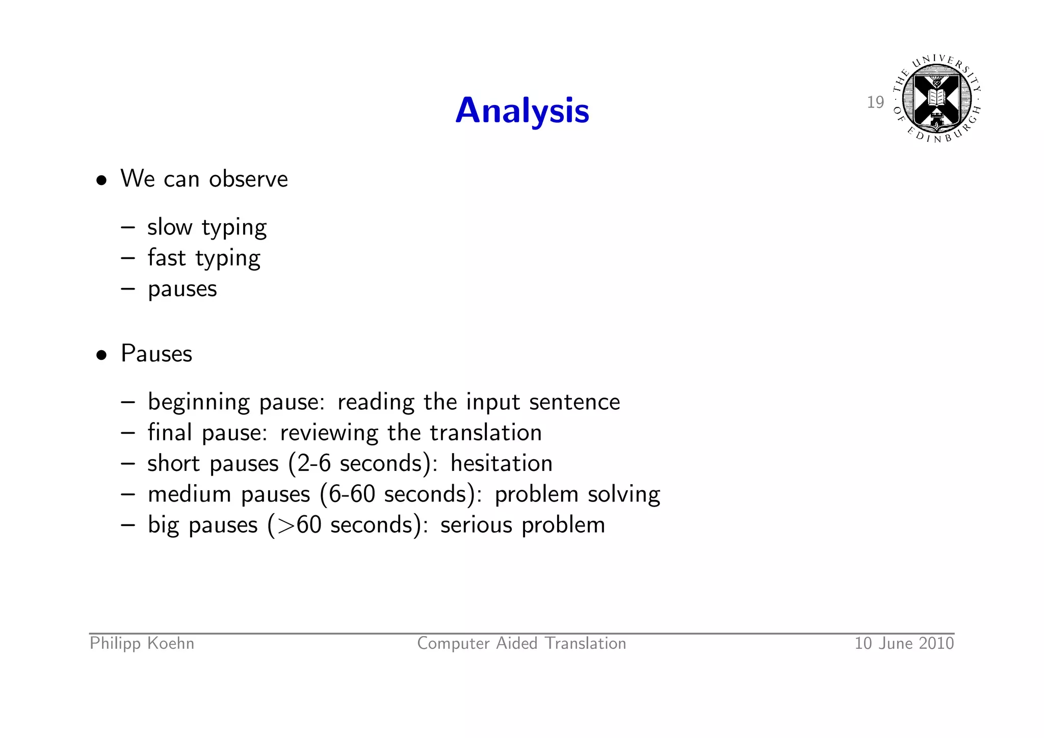 30. 30. 19 Analysis • We can observe – slow typing – fast typing – pauses • Pauses – beginning pause: reading the input sentence – final pause: reviewing the translation – short pauses (2-6 seconds): hesitation – medium pauses (6-60 seconds): problem solving – big pauses (>60 seconds): serious problem Philipp Koehn Computer Aided Translation 10 June 2010