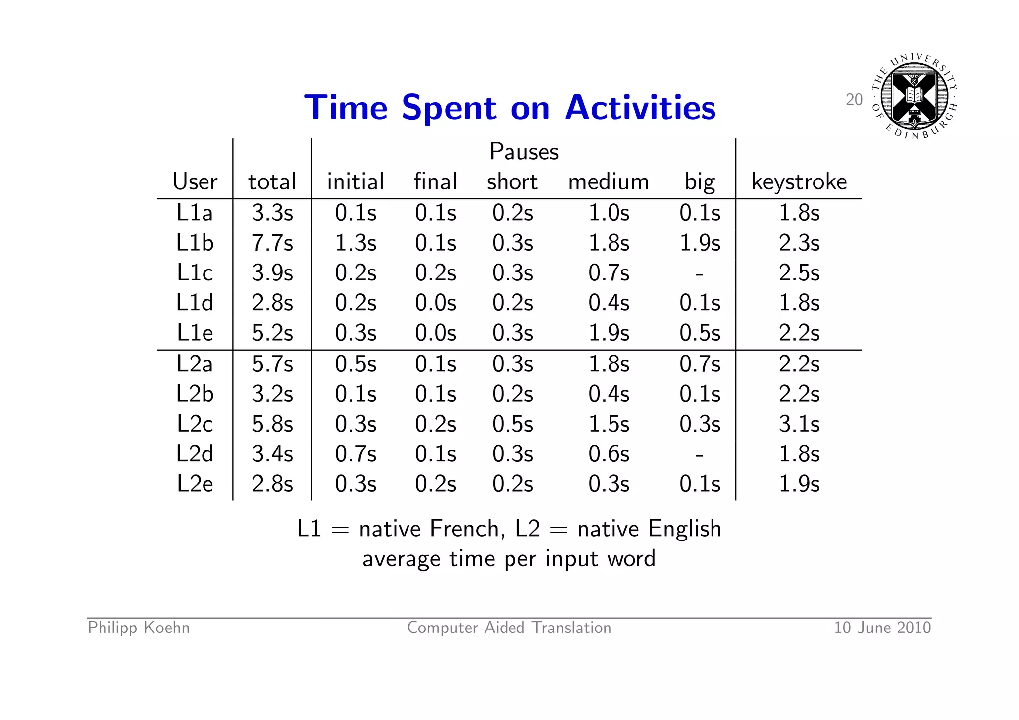34. 34. 23 Time Spent on Activities not much time Pauses differences similar User total initial final short medium big keystroke L1a 3.3s 0.1s 0.1s 0.2s 1.0s 0.1s 1.8s L1b 7.7s 1.3s 0.1s 0.3s 1.8s 1.9s 2.3s L1c 3.9s 0.2s 0.2s 0.3s 0.7s - 2.5s L1d 2.8s 0.2s 0.0s 0.2s 0.4s 0.1s 1.8s L1e 5.2s 0.3s 0.0s 0.3s 1.9s 0.5s 2.2s L2a 5.7s 0.5s 0.1s 0.3s 1.8s 0.7s 2.2s L2b 3.2s 0.1s 0.1s 0.2s 0.4s 0.1s 2.2s L2c 5.8s 0.3s 0.2s 0.5s 1.5s 0.3s 3.1s L2d 3.4s 0.7s 0.1s 0.3s 0.6s - 1.8s L2e 2.8s 0.3s 0.2s 0.2s 0.3s 0.1s 1.9s L1 = native French, L2 = native English average time per input word Philipp Koehn Computer Aided Translation 10 June 2010
