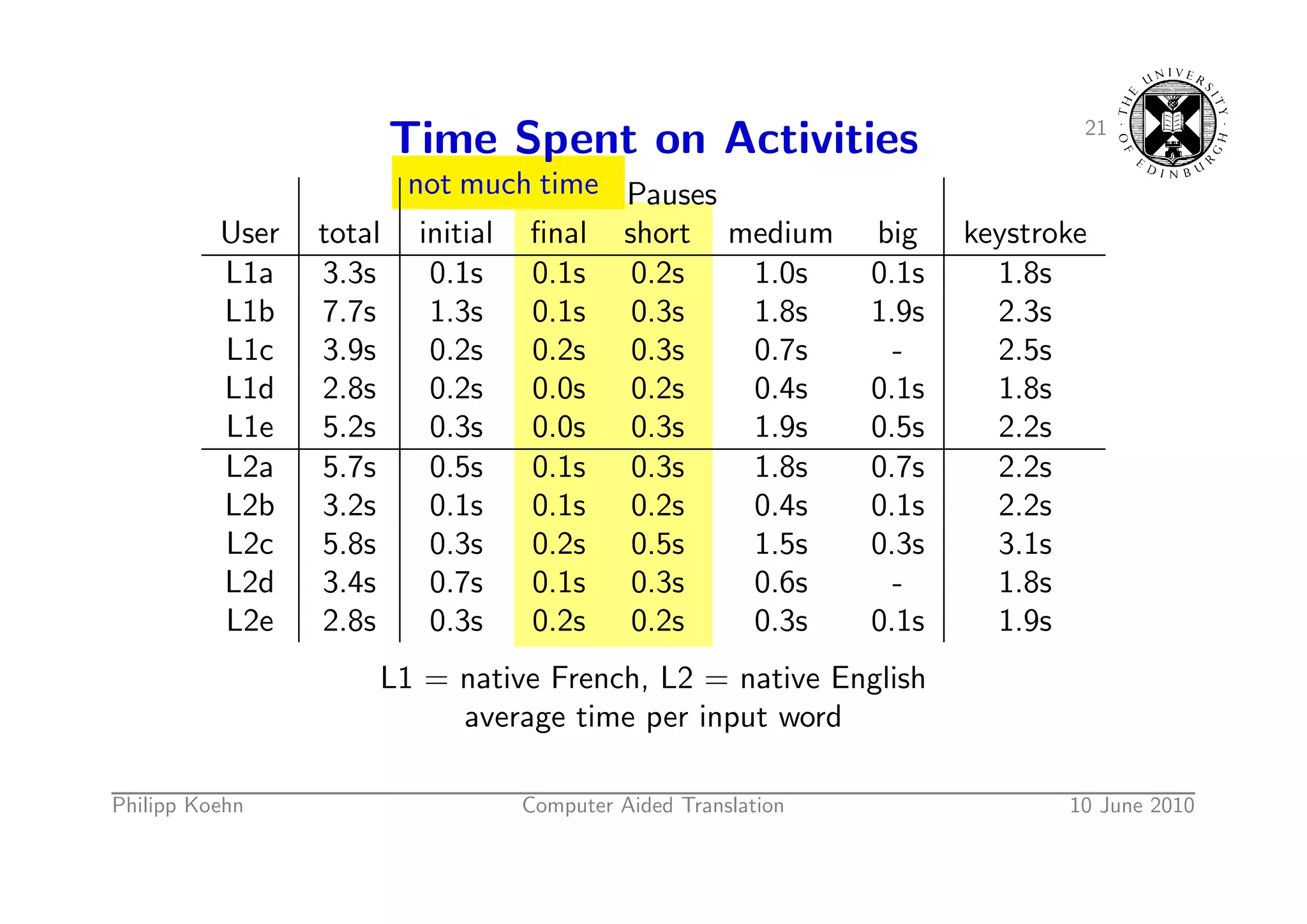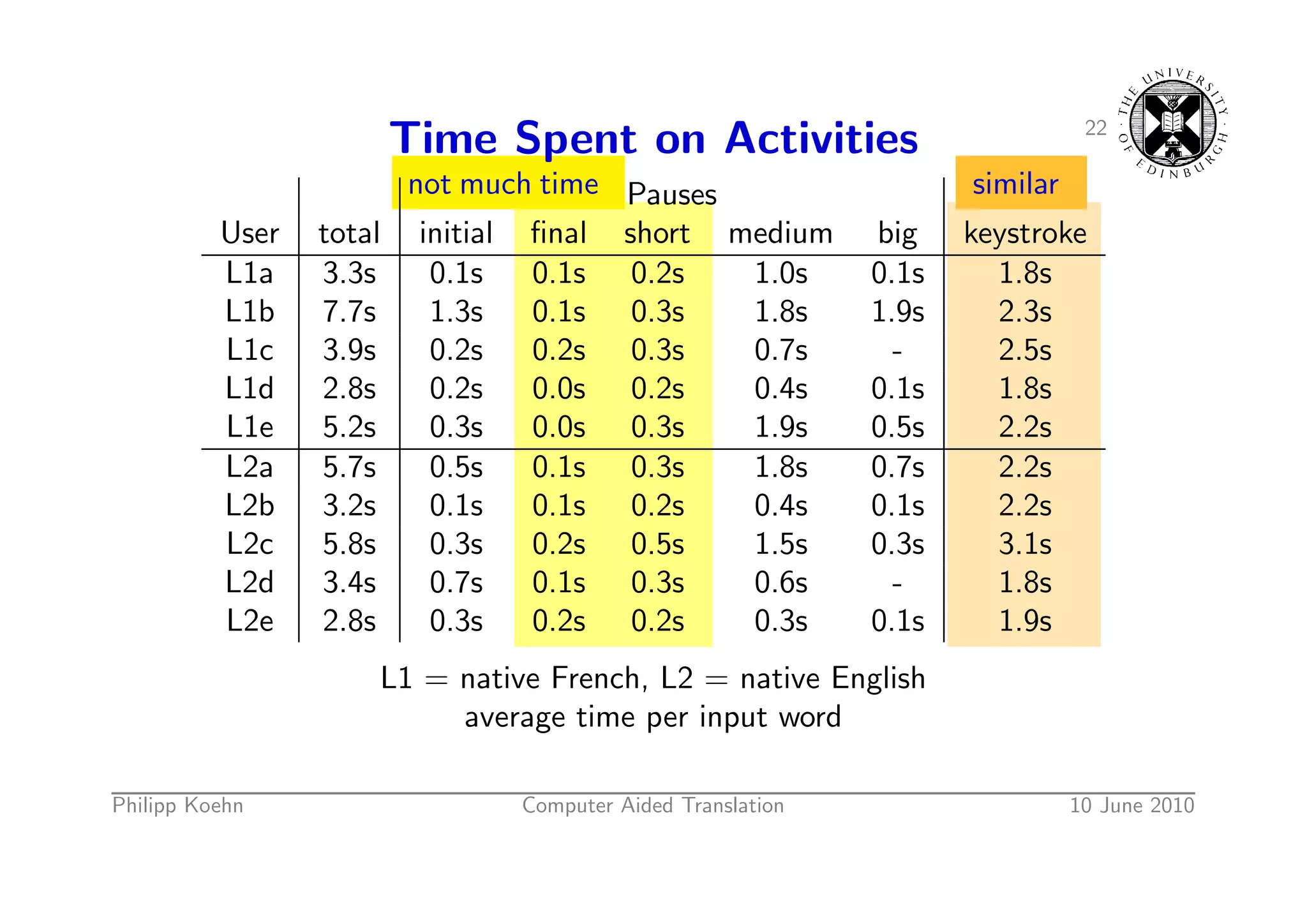 32. 32. 21 Time Spent on Activities not much time Pauses User total initial final short medium big keystroke L1a 3.3s 0.1s 0.1s 0.2s 1.0s 0.1s 1.8s L1b 7.7s 1.3s 0.1s 0.3s 1.8s 1.9s 2.3s L1c 3.9s 0.2s 0.2s 0.3s 0.7s - 2.5s L1d 2.8s 0.2s 0.0s 0.2s 0.4s 0.1s 1.8s L1e 5.2s 0.3s 0.0s 0.3s 1.9s 0.5s 2.2s L2a 5.7s 0.5s 0.1s 0.3s 1.8s 0.7s 2.2s L2b 3.2s 0.1s 0.1s 0.2s 0.4s 0.1s 2.2s L2c 5.8s 0.3s 0.2s 0.5s 1.5s 0.3s 3.1s L2d 3.4s 0.7s 0.1s 0.3s 0.6s - 1.8s L2e 2.8s 0.3s 0.2s 0.2s 0.3s 0.1s 1.9s L1 = native French, L2 = native English average time per input word Philipp Koehn Computer Aided Translation 10 June 2010