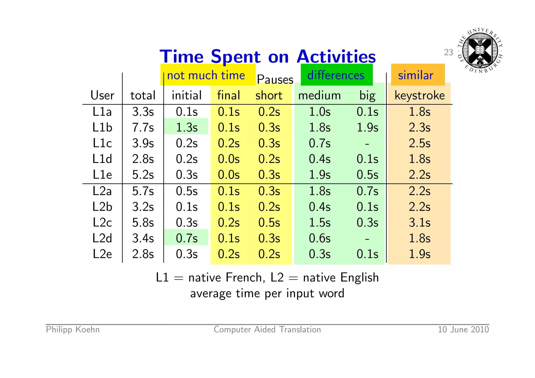 33. 33. 22 Time Spent on Activities not much time Pauses similar User total initial final short medium big keystroke L1a 3.3s 0.1s 0.1s 0.2s 1.0s 0.1s 1.8s L1b 7.7s 1.3s 0.1s 0.3s 1.8s 1.9s 2.3s L1c 3.9s 0.2s 0.2s 0.3s 0.7s - 2.5s L1d 2.8s 0.2s 0.0s 0.2s 0.4s 0.1s 1.8s L1e 5.2s 0.3s 0.0s 0.3s 1.9s 0.5s 2.2s L2a 5.7s 0.5s 0.1s 0.3s 1.8s 0.7s 2.2s L2b 3.2s 0.1s 0.1s 0.2s 0.4s 0.1s 2.2s L2c 5.8s 0.3s 0.2s 0.5s 1.5s 0.3s 3.1s L2d 3.4s 0.7s 0.1s 0.3s 0.6s - 1.8s L2e 2.8s 0.3s 0.2s 0.2s 0.3s 0.1s 1.9s L1 = native French, L2 = native English average time per input word Philipp Koehn Computer Aided Translation 10 June 2010