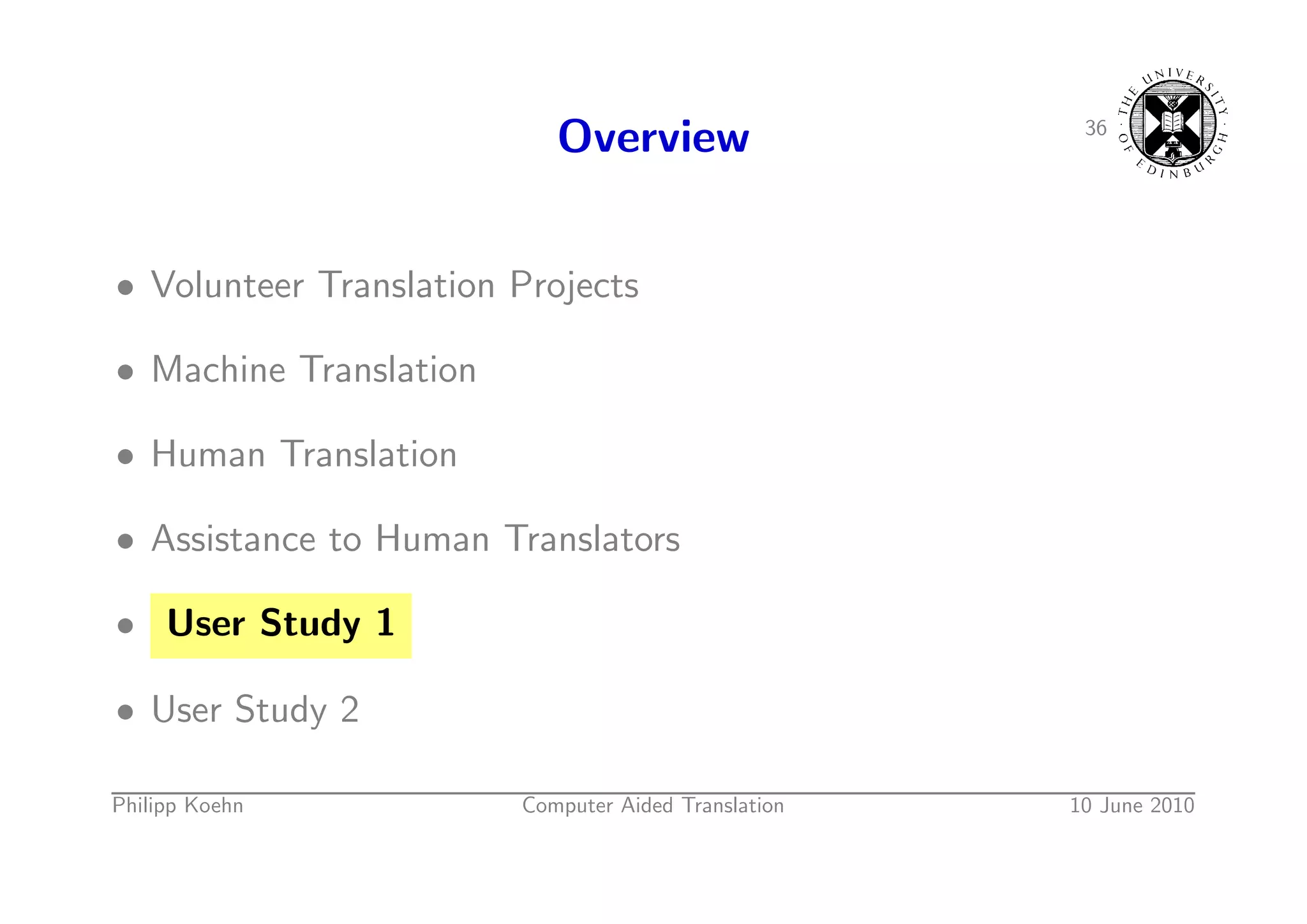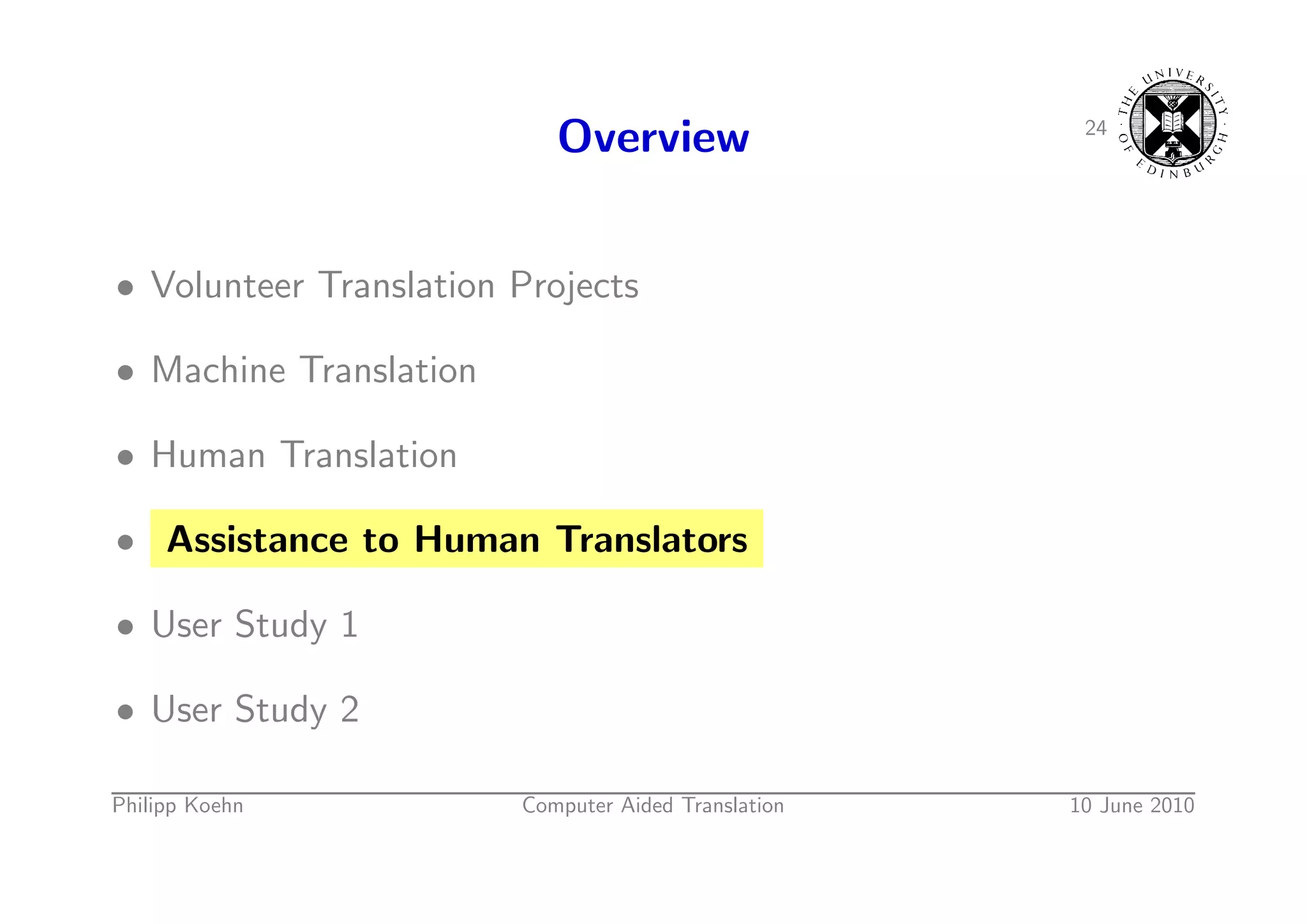 35. 35. 24 Overview • Volunteer Translation Projects • Machine Translation • Human Translation • Assistance to Human Translators • User Study 1 • User Study 2 Philipp Koehn Computer Aided Translation 10 June 2010