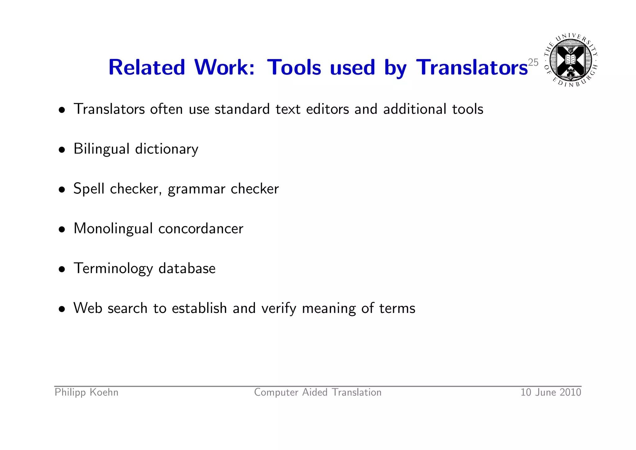 36. 36. Related Work: Tools used by Translators25 • Translators often use standard text editors and additional tools • Bilingual dictionary • Spell checker, grammar checker • Monolingual concordancer • Terminology database • Web search to establish and verify meaning of terms Philipp Koehn Computer Aided Translation 10 June 2010