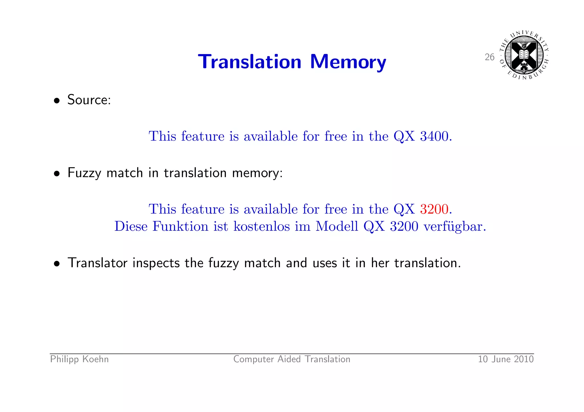 37. 37. 26 Translation Memory • Source: This feature is available for free in the QX 3400. • Fuzzy match in translation memory: This feature is available for free in the QX 3200. Diese Funktion ist kostenlos im Modell QX 3200 verf¨gbar. u • Translator inspects the fuzzy match and uses it in her translation. Philipp Koehn Computer Aided Translation 10 June 2010