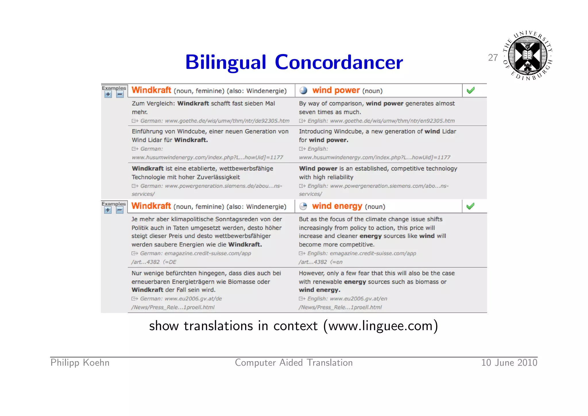 38. 38. 27 Bilingual Concordancer show translations in context (www.linguee.com) Philipp Koehn Computer Aided Translation 10 June 2010