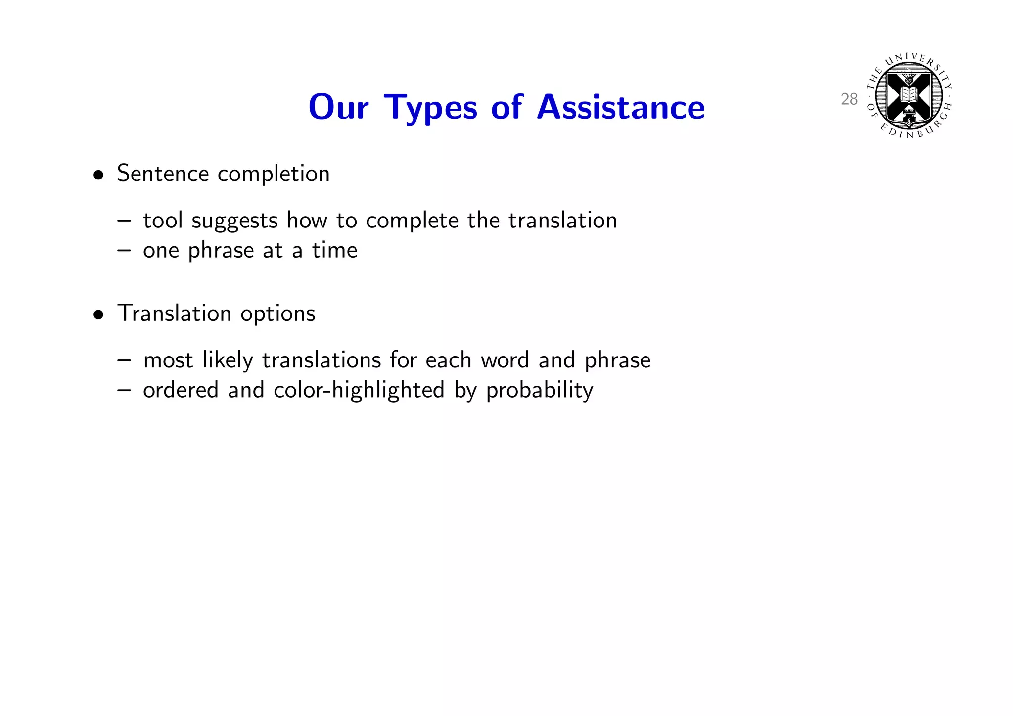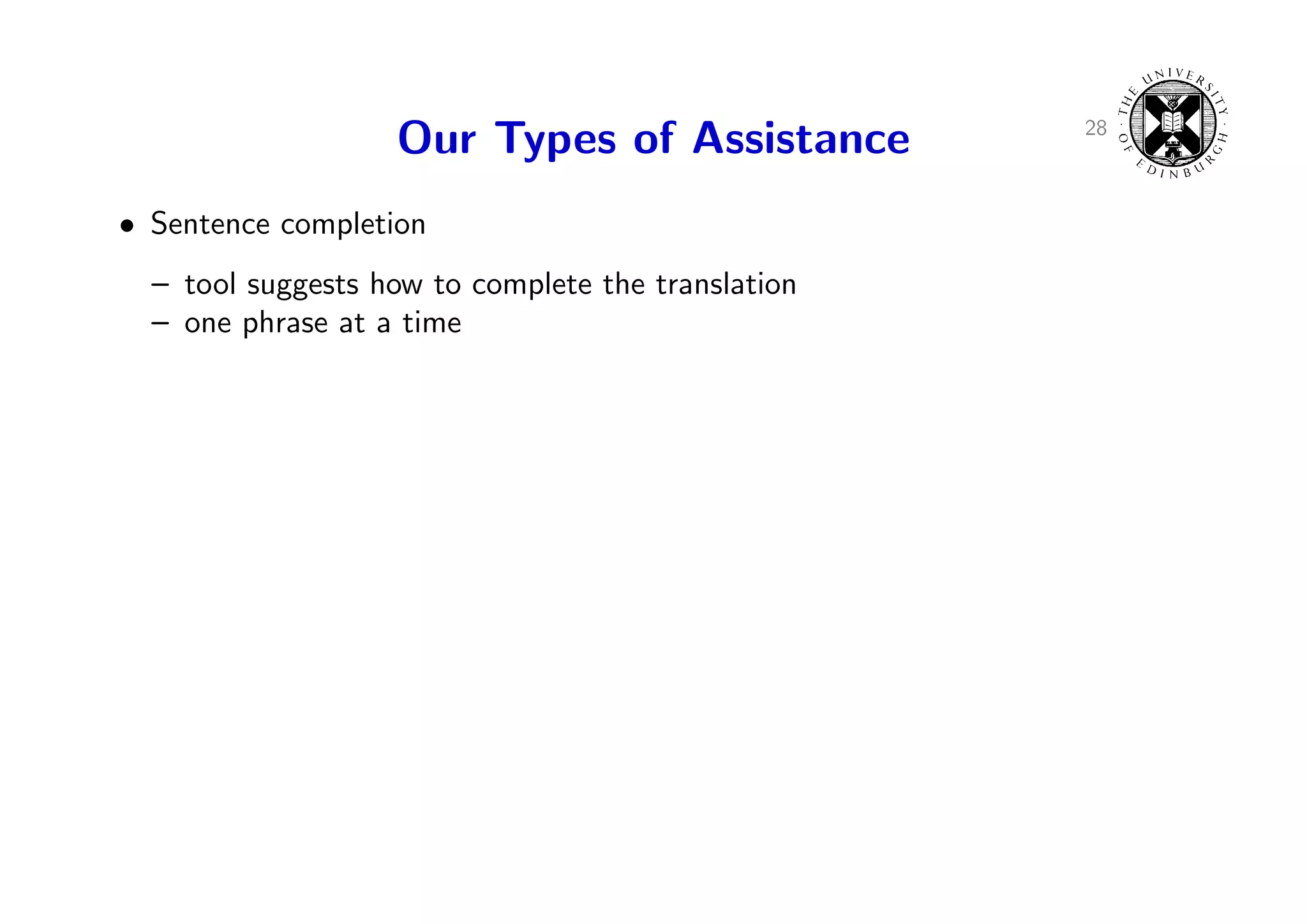 39. 39. 28 Our Types of Assistance • Sentence completion – tool suggests how to complete the translation – one phrase at a time