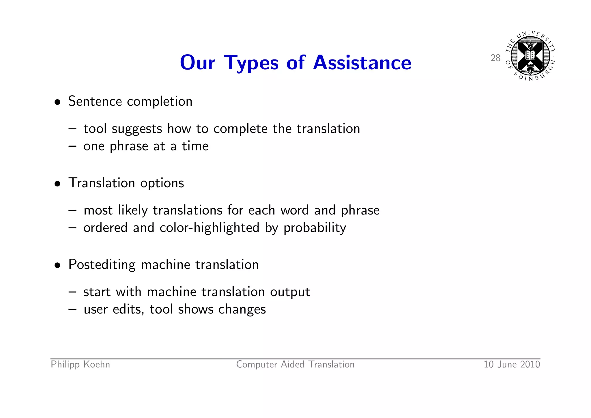 41. 41. 28 Our Types of Assistance • Sentence completion – tool suggests how to complete the translation – one phrase at a time • Translation options – most likely translations for each word and phrase – ordered and color-highlighted by probability • Postediting machine translation – start with machine translation output – user edits, tool shows changes Philipp Koehn Computer Aided Translation 10 June 2010