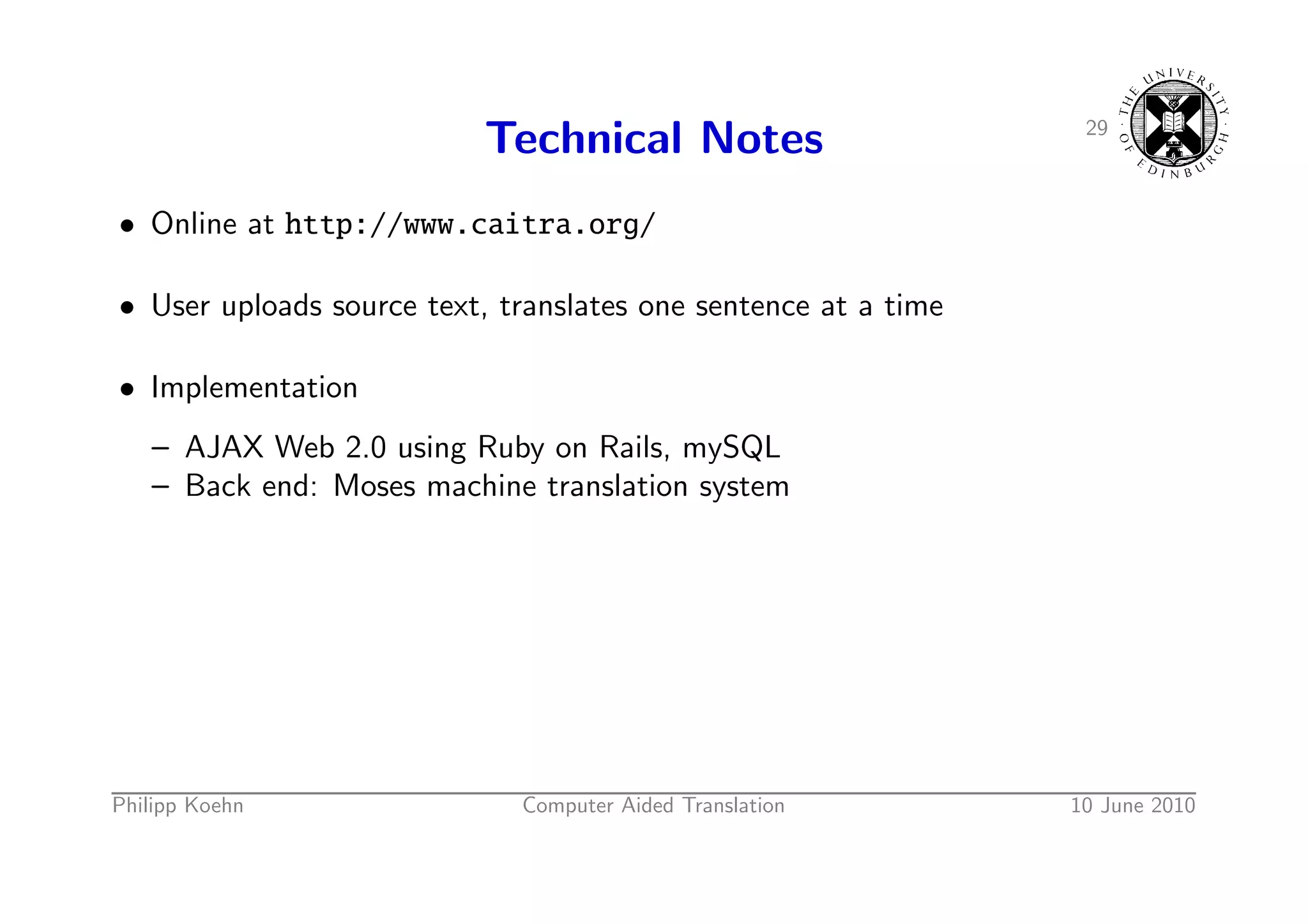 42. 42. 29 Technical Notes • Online at http://www.caitra.org/ • User uploads source text, translates one sentence at a time • Implementation – AJAX Web 2.0 using Ruby on Rails, mySQL – Back end: Moses machine translation system Philipp Koehn Computer Aided Translation 10 June 2010