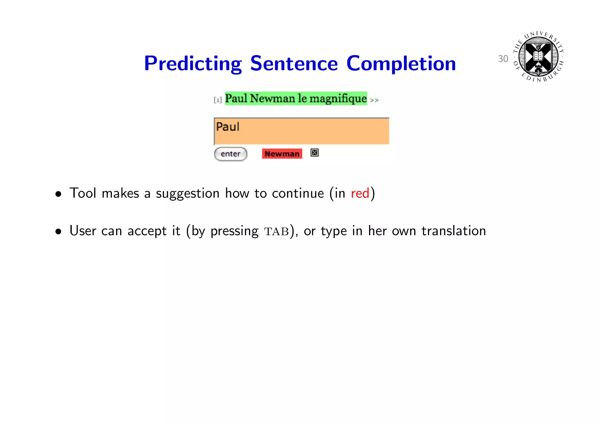44. 44. 30 Predicting Sentence Completion • Tool makes a suggestion how to continue (in red) • User can accept it (by pressing tab), or type in her own translation