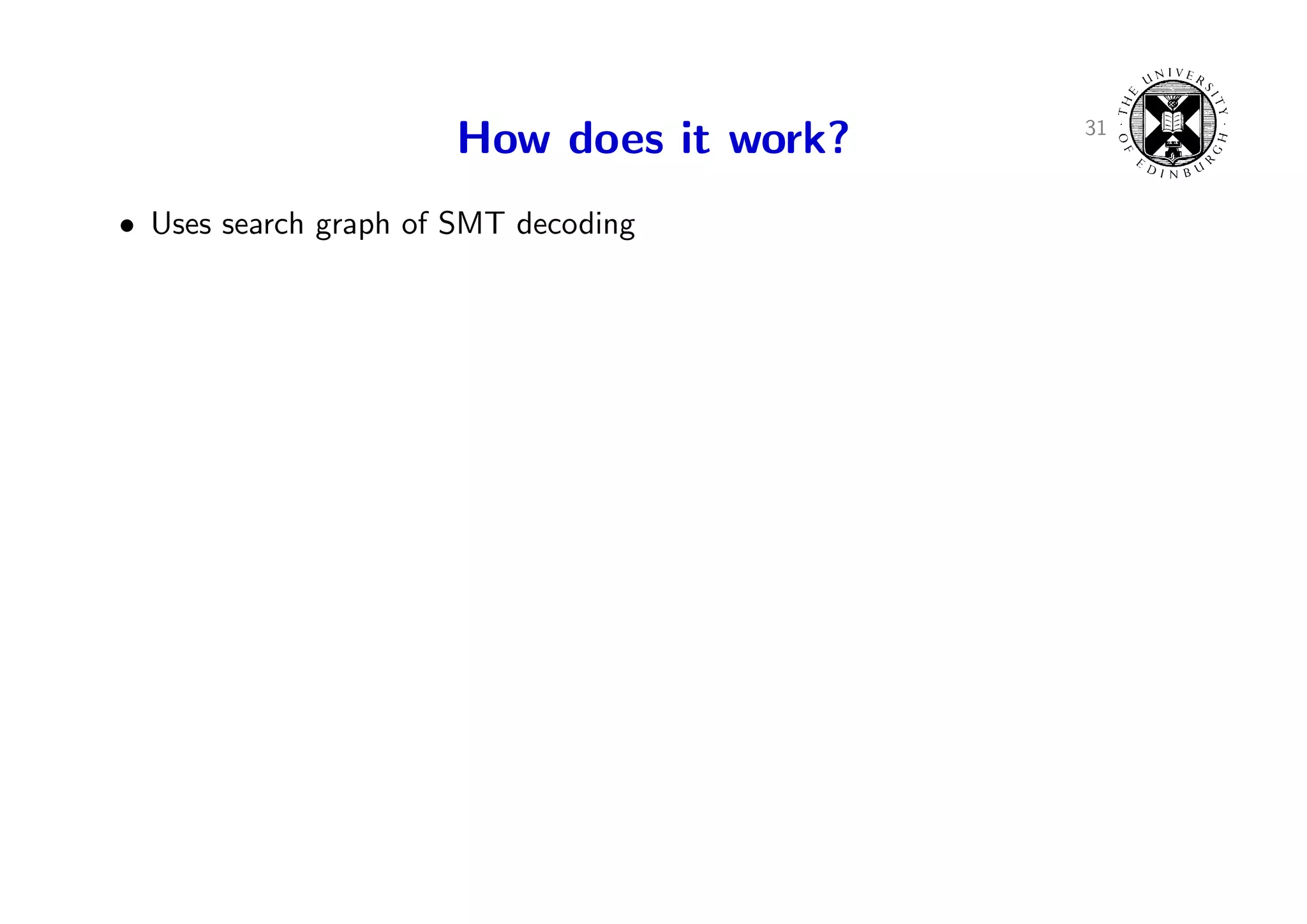46. 46. 31 How does it work? • Uses search graph of SMT decoding