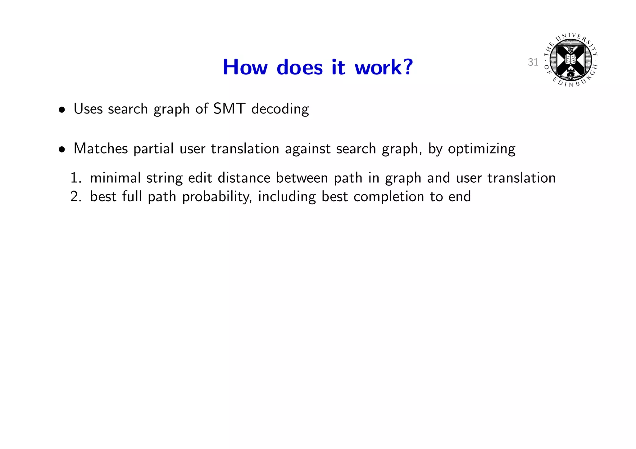 47. 47. 31 How does it work? • Uses search graph of SMT decoding • Matches partial user translation against search graph, by optimizing 1. minimal string edit distance between path in graph and user translation 2. best full path probability, including best completion to end