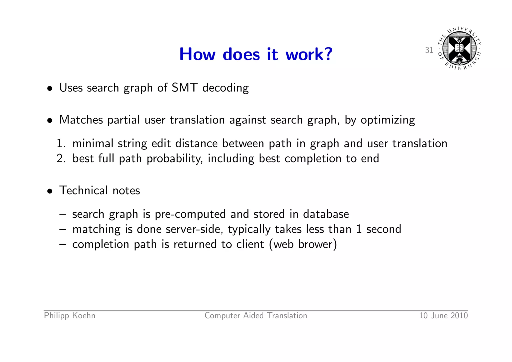 48. 48. 31 How does it work? • Uses search graph of SMT decoding • Matches partial user translation against search graph, by optimizing 1. minimal string edit distance between path in graph and user translation 2. best full path probability, including best completion to end • Technical notes – search graph is pre-computed and stored in database – matching is done server-side, typically takes less than 1 second – completion path is returned to client (web brower) Philipp Koehn Computer Aided Translation 10 June 2010