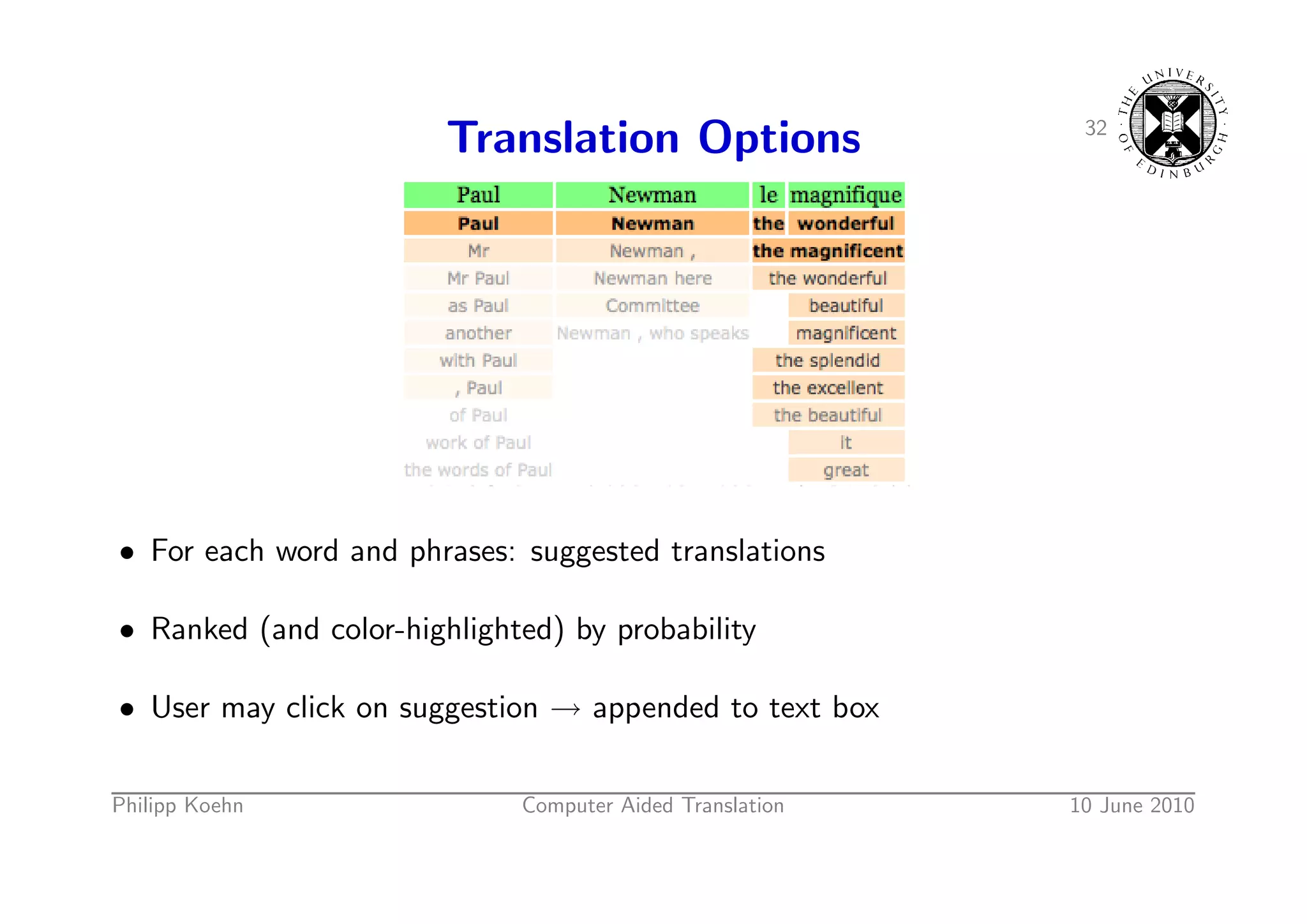 49. 49. 32 Translation Options • For each word and phrases: suggested translations • Ranked (and color-highlighted) by probability • User may click on suggestion → appended to text box Philipp Koehn Computer Aided Translation 10 June 2010