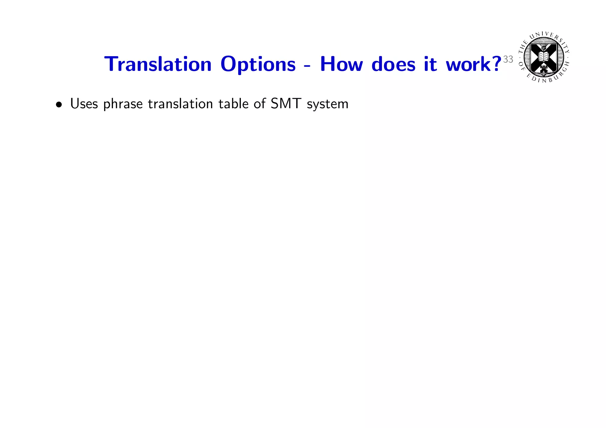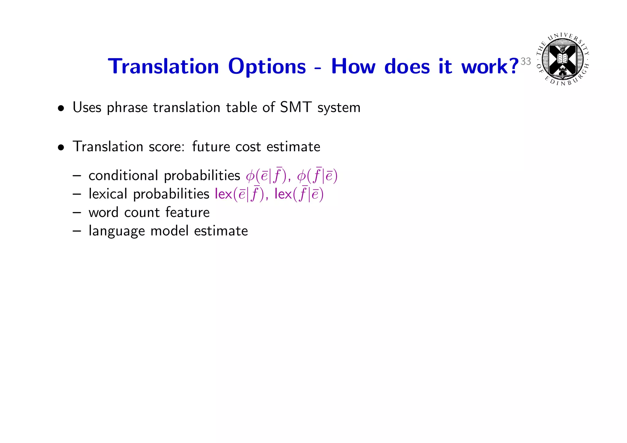 51. 51. Translation Options - How does it work?33 • Uses phrase translation table of SMT system • Translation score: future cost estimate – e ¯ ¯e conditional probabilities φ(¯|f ), φ(f |¯) – e ¯ ¯e lexical probabilities lex(¯|f ), lex(f |¯) – word count feature – language model estimate