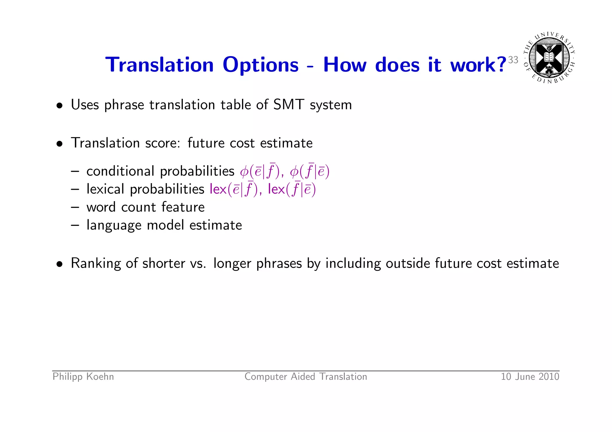52. 52. Translation Options - How does it work?33 • Uses phrase translation table of SMT system • Translation score: future cost estimate – e ¯ ¯e conditional probabilities φ(¯|f ), φ(f |¯) – e ¯ ¯e lexical probabilities lex(¯|f ), lex(f |¯) – word count feature – language model estimate • Ranking of shorter vs. longer phrases by including outside future cost estimate Philipp Koehn Computer Aided Translation 10 June 2010