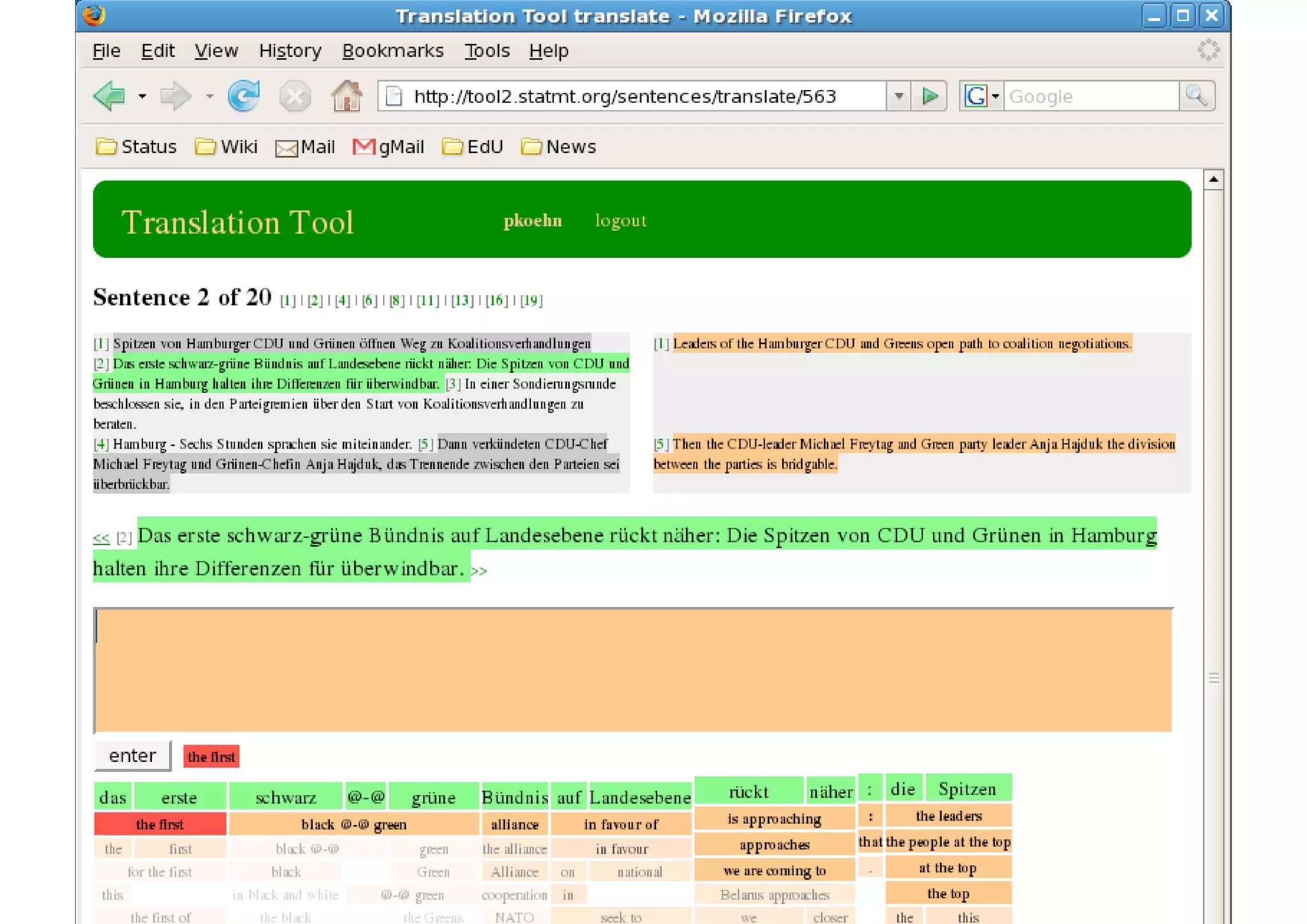 53. 53. 35 Postediting Machine Translation • Textbox is initially filled with machine translation • User edits translation • String edit distance to machine translation is shown (blue background) Philipp Koehn Computer Aided Translation 10 June 2010