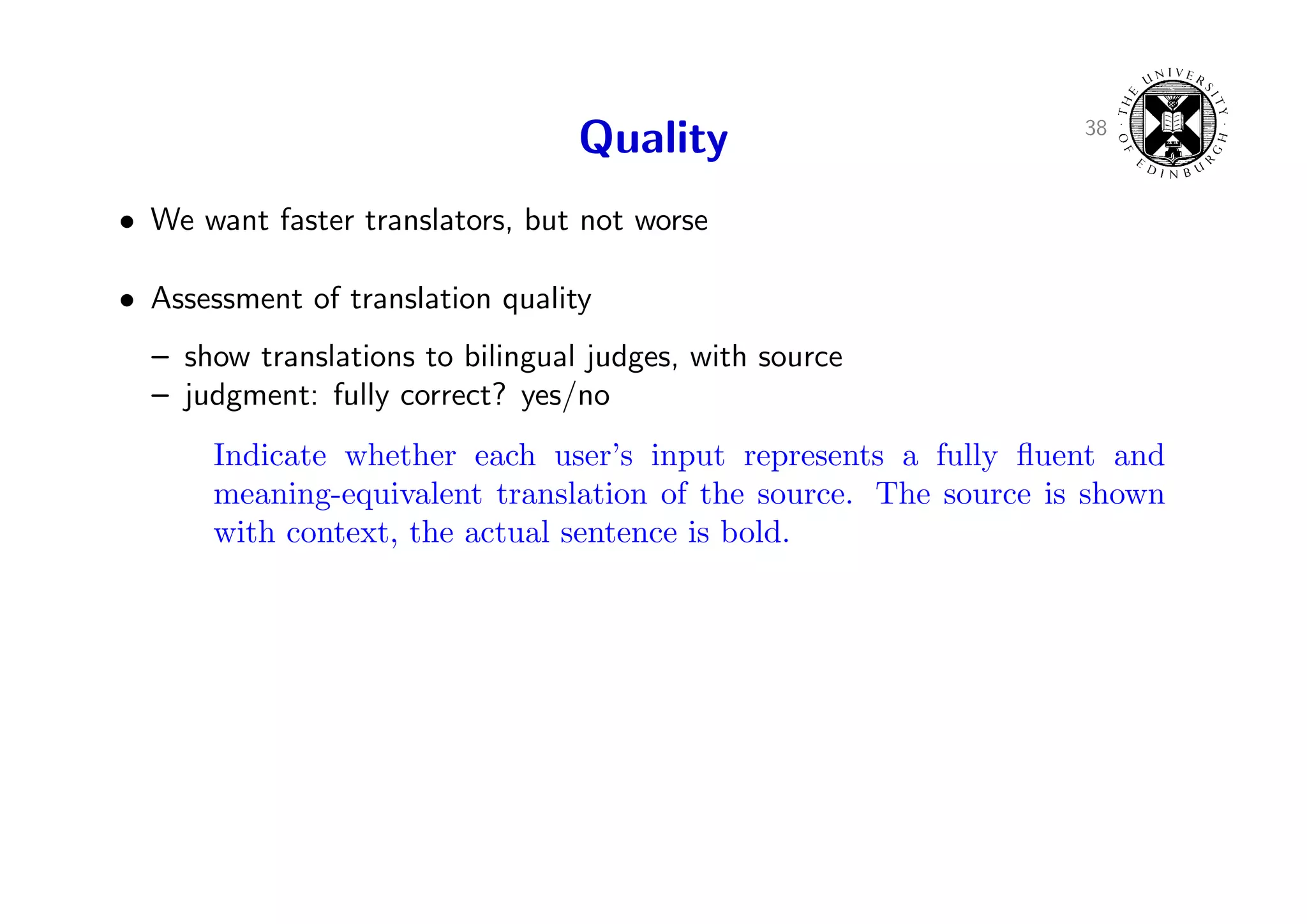 57. 57. 38 Quality • We want faster translators, but not worse • Assessment of translation quality – show translations to bilingual judges, with source – judgment: fully correct? yes/no Indicate whether each user’s input represents a fully fluent and meaning-equivalent translation of the source. The source is shown with context, the actual sentence is bold.