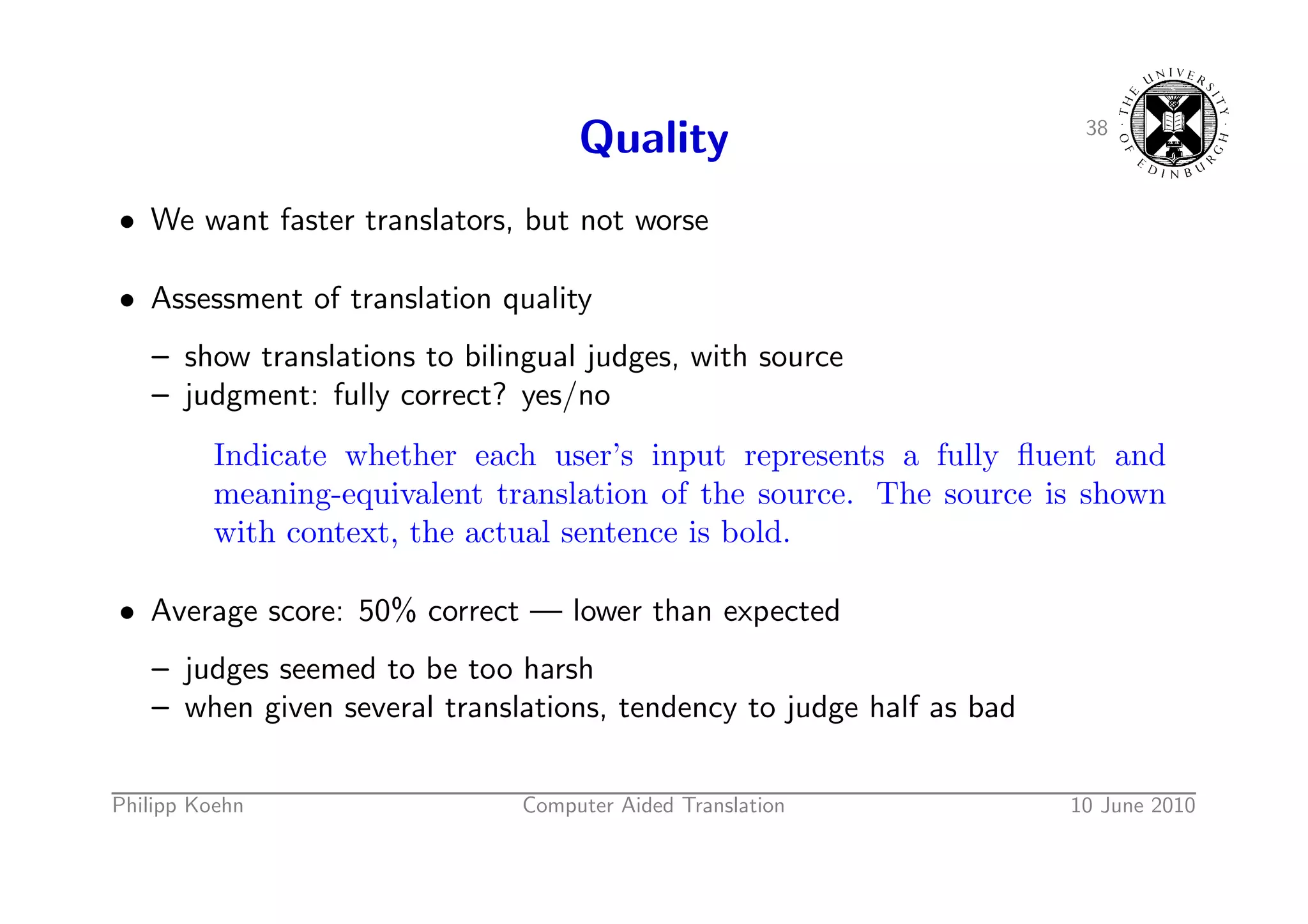 58. 58. 38 Quality • We want faster translators, but not worse • Assessment of translation quality – show translations to bilingual judges, with source – judgment: fully correct? yes/no Indicate whether each user’s input represents a fully fluent and meaning-equivalent translation of the source. The source is shown with context, the actual sentence is bold. • Average score: 50% correct — lower than expected – judges seemed to be too harsh – when given several translations, tendency to judge half as bad Philipp Koehn Computer Aided Translation 10 June 2010