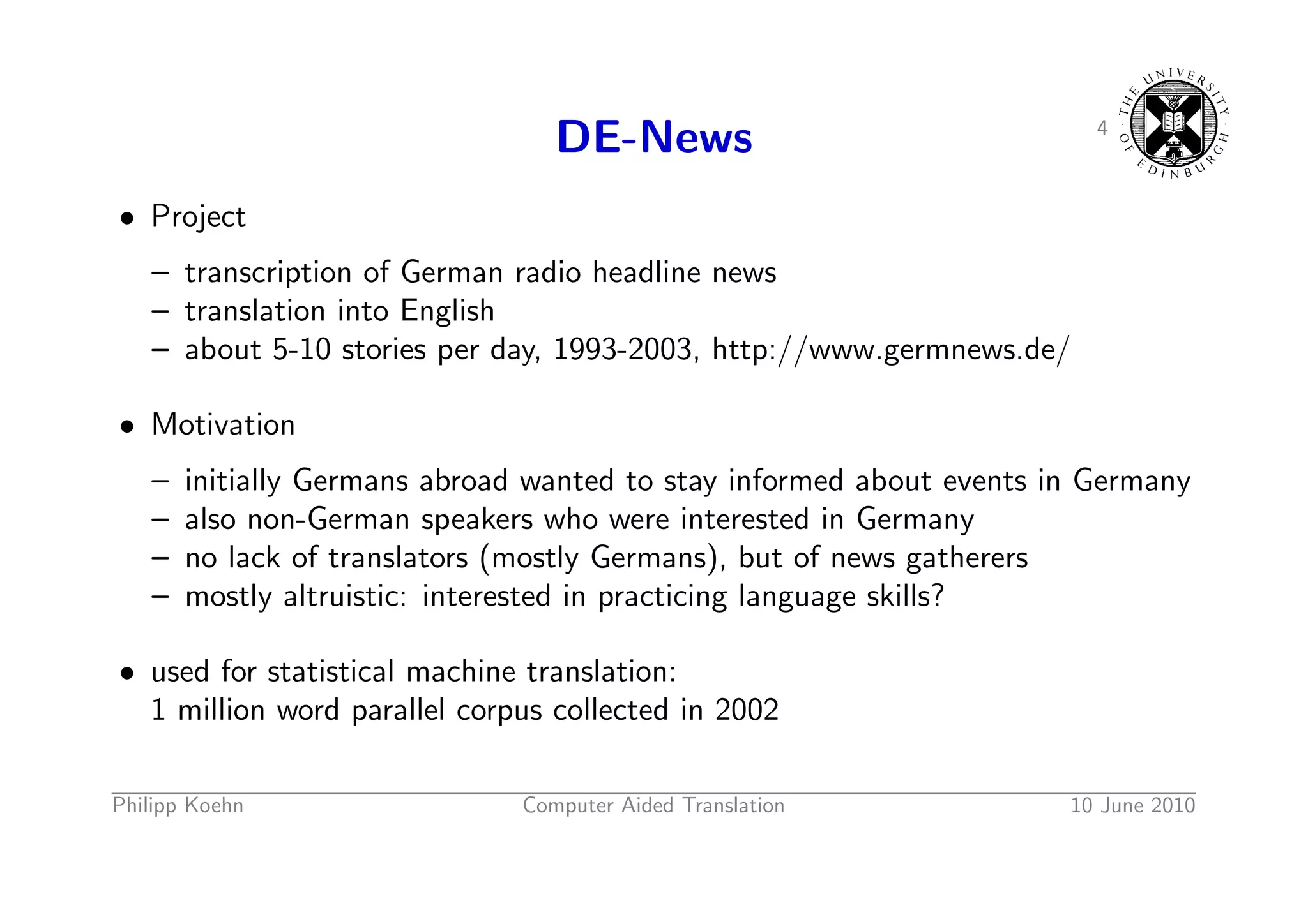 6. 6. 4 DE-News • Project – transcription of German radio headline news – translation into English – about 5-10 stories per day, 1993-2003, http://www.germnews.de/ • Motivation – initially Germans abroad wanted to stay informed about events in Germany – also non-German speakers who were interested in Germany – no lack of translators (mostly Germans), but of news gatherers – mostly altruistic: interested in practicing language skills? • used for statistical machine translation: 1 million word parallel corpus collected in 2002 Philipp Koehn Computer Aided Translation 10 June 2010