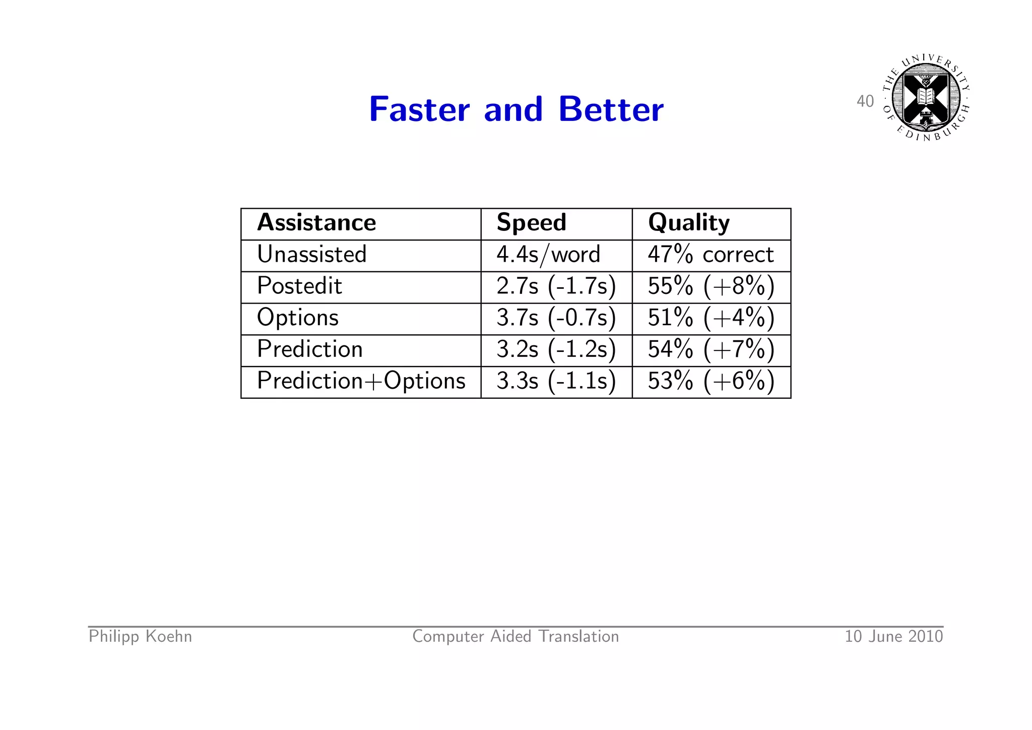 60. 60. 40 Faster and Better Assistance Speed Quality Unassisted 4.4s/word 47% correct Postedit 2.7s (-1.7s) 55% (+8%) Options 3.7s (-0.7s) 51% (+4%) Prediction 3.2s (-1.2s) 54% (+7%) Prediction+Options 3.3s (-1.1s) 53% (+6%) Philipp Koehn Computer Aided Translation 10 June 2010