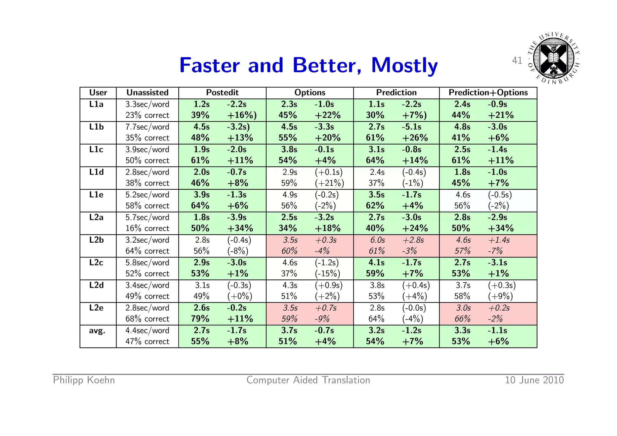 61. 61. 41 Faster and Better, Mostly User Unassisted Postedit Options Prediction Prediction+Options L1a 3.3sec/word 1.2s -2.2s 2.3s -1.0s 1.1s -2.2s 2.4s -0.9s 23% correct 39% +16%) 45% +22% 30% +7%) 44% +21% L1b 7.7sec/word 4.5s -3.2s) 4.5s -3.3s 2.7s -5.1s 4.8s -3.0s 35% correct 48% +13% 55% +20% 61% +26% 41% +6% L1c 3.9sec/word 1.9s -2.0s 3.8s -0.1s 3.1s -0.8s 2.5s -1.4s 50% correct 61% +11% 54% +4% 64% +14% 61% +11% L1d 2.8sec/word 2.0s -0.7s 2.9s (+0.1s) 2.4s (-0.4s) 1.8s -1.0s 38% correct 46% +8% 59% (+21%) 37% (-1%) 45% +7% L1e 5.2sec/word 3.9s -1.3s 4.9s (-0.2s) 3.5s -1.7s 4.6s (-0.5s) 58% correct 64% +6% 56% (-2%) 62% +4% 56% (-2%) L2a 5.7sec/word 1.8s -3.9s 2.5s -3.2s 2.7s -3.0s 2.8s -2.9s 16% correct 50% +34% 34% +18% 40% +24% 50% +34% L2b 3.2sec/word 2.8s (-0.4s) 3.5s +0.3s 6.0s +2.8s 4.6s +1.4s 64% correct 56% (-8%) 60% -4% 61% -3% 57% -7% L2c 5.8sec/word 2.9s -3.0s 4.6s (-1.2s) 4.1s -1.7s 2.7s -3.1s 52% correct 53% +1% 37% (-15%) 59% +7% 53% +1% L2d 3.4sec/word 3.1s (-0.3s) 4.3s (+0.9s) 3.8s (+0.4s) 3.7s (+0.3s) 49% correct 49% (+0%) 51% (+2%) 53% (+4%) 58% (+9%) L2e 2.8sec/word 2.6s -0.2s 3.5s +0.7s 2.8s (-0.0s) 3.0s +0.2s 68% correct 79% +11% 59% -9% 64% (-4%) 66% -2% avg. 4.4sec/word 2.7s -1.7s 3.7s -0.7s 3.2s -1.2s 3.3s -1.1s 47% correct 55% +8% 51% +4% 54% +7% 53% +6% Philipp Koehn Computer Aided Translation 10 June 2010