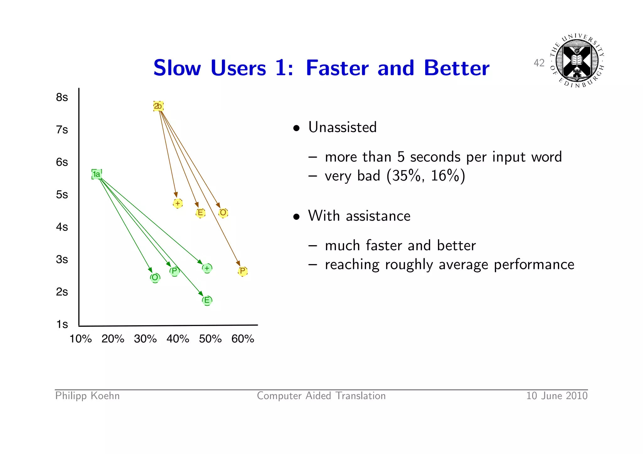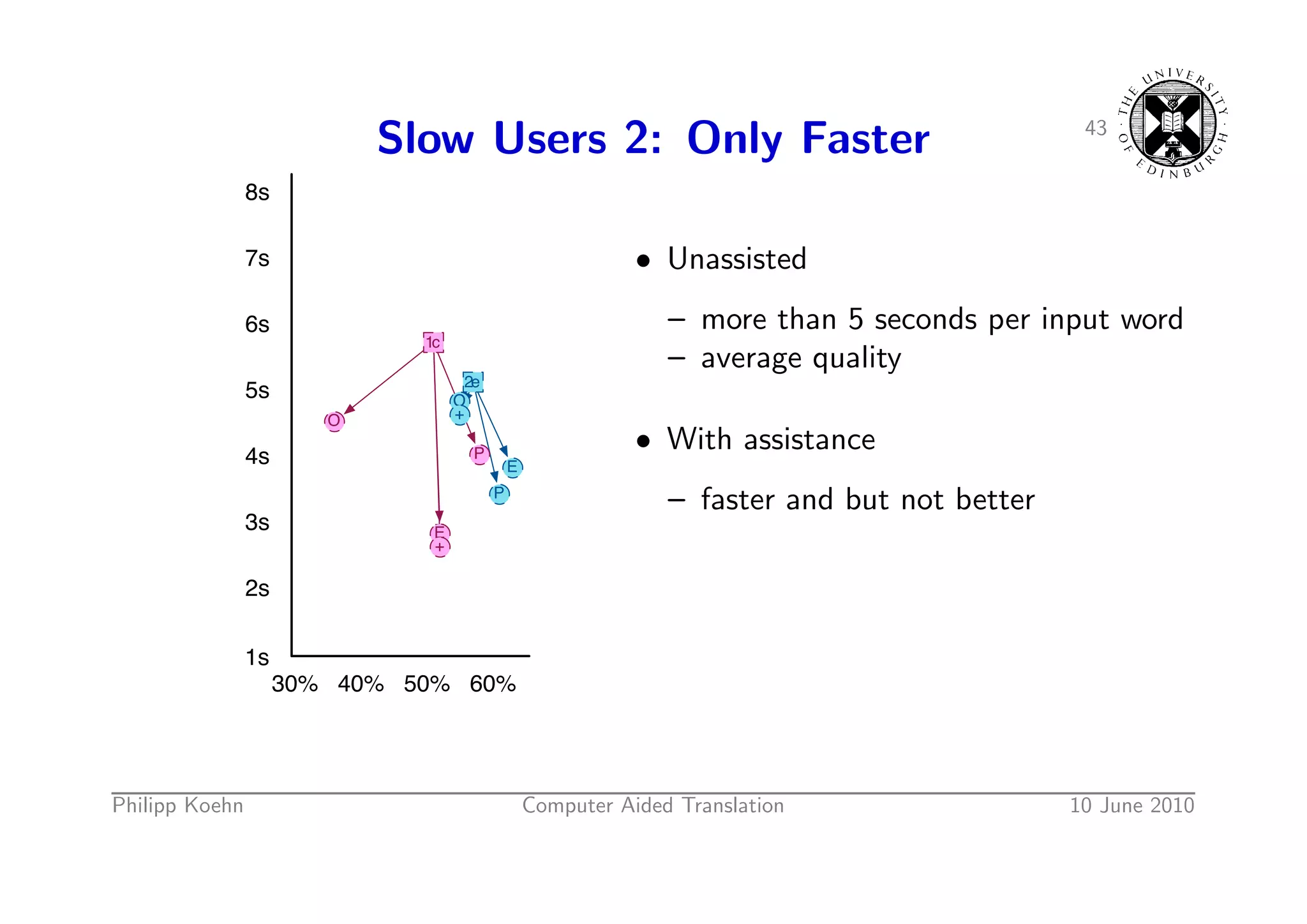 62. 62. 42 Slow Users 1: Faster and Better 8s 2b 7s • Unassisted 6s – more than 5 seconds per input word 1a – very bad (35%, 16%) 5s + E O • With assistance 4s – much faster and better 3s P + P – reaching roughly average performance O 2s E 1s 10% 20% 30% 40% 50% 60% Philipp Koehn Computer Aided Translation 10 June 2010