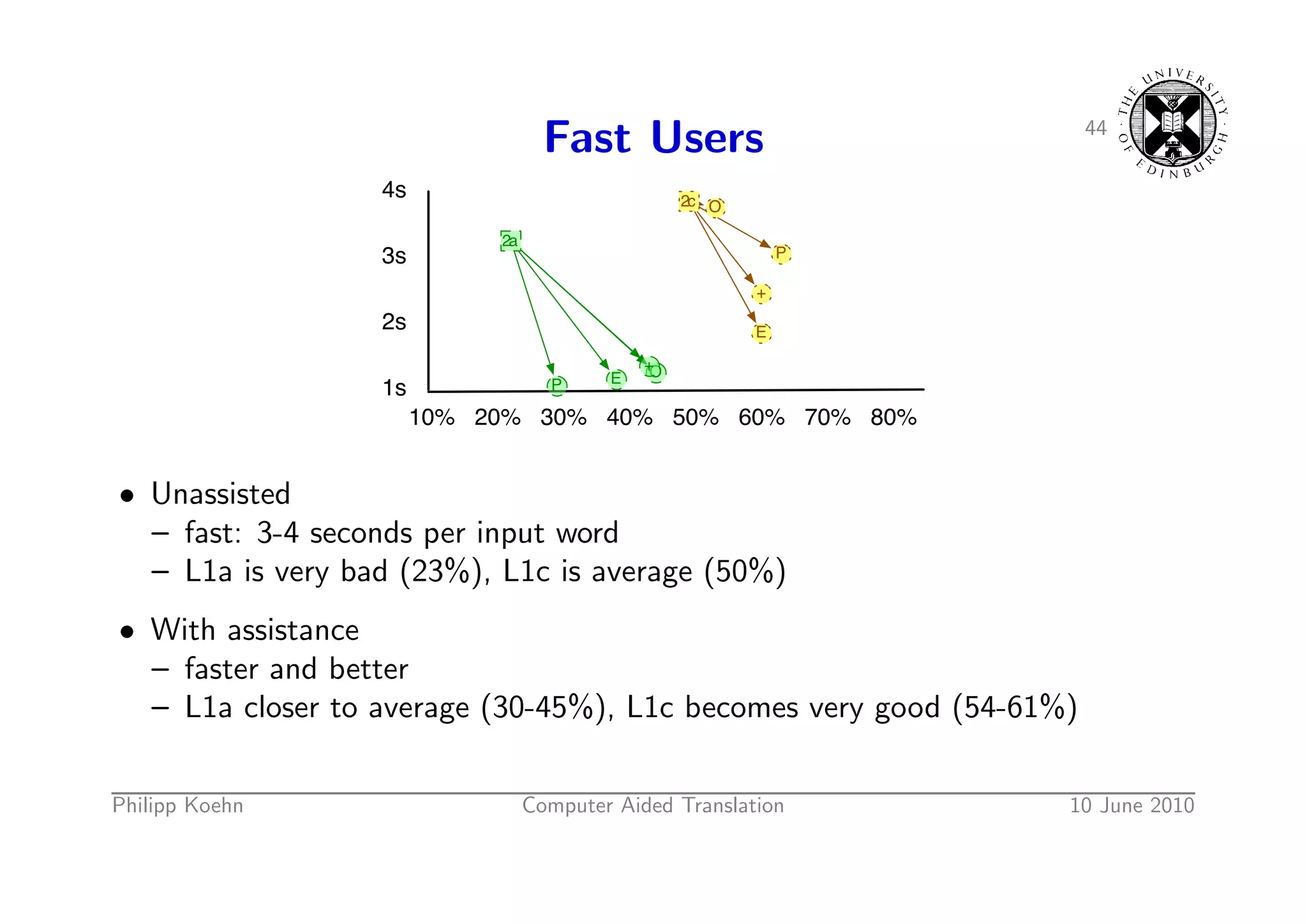63. 63. 43 Slow Users 2: Only Faster 8s 7s • Unassisted 6s – more than 5 seconds per input word 1c – average quality 2e 5s O O + 4s P • With assistance E P – faster and but not better 3s E + 2s 1s 30% 40% 50% 60% Philipp Koehn Computer Aided Translation 10 June 2010