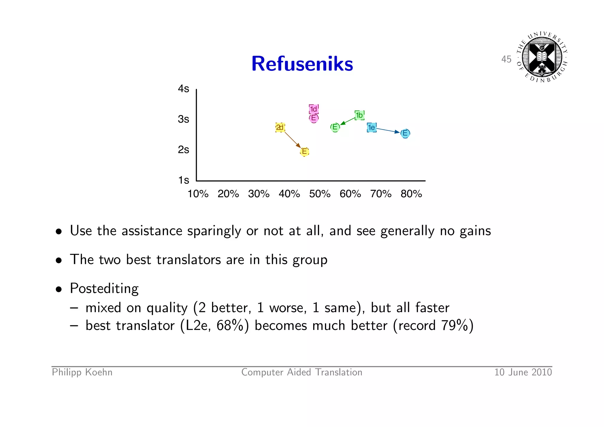 65. 65. 45 Refuseniks 4s 1d 1b 3s E 2d E 1e E 2s E 1s 10% 20% 30% 40% 50% 60% 70% 80% • Use the assistance sparingly or not at all, and see generally no gains • The two best translators are in this group • Postediting – mixed on quality (2 better, 1 worse, 1 same), but all faster – best translator (L2e, 68%) becomes much better (record 79%) Philipp Koehn Computer Aided Translation 10 June 2010