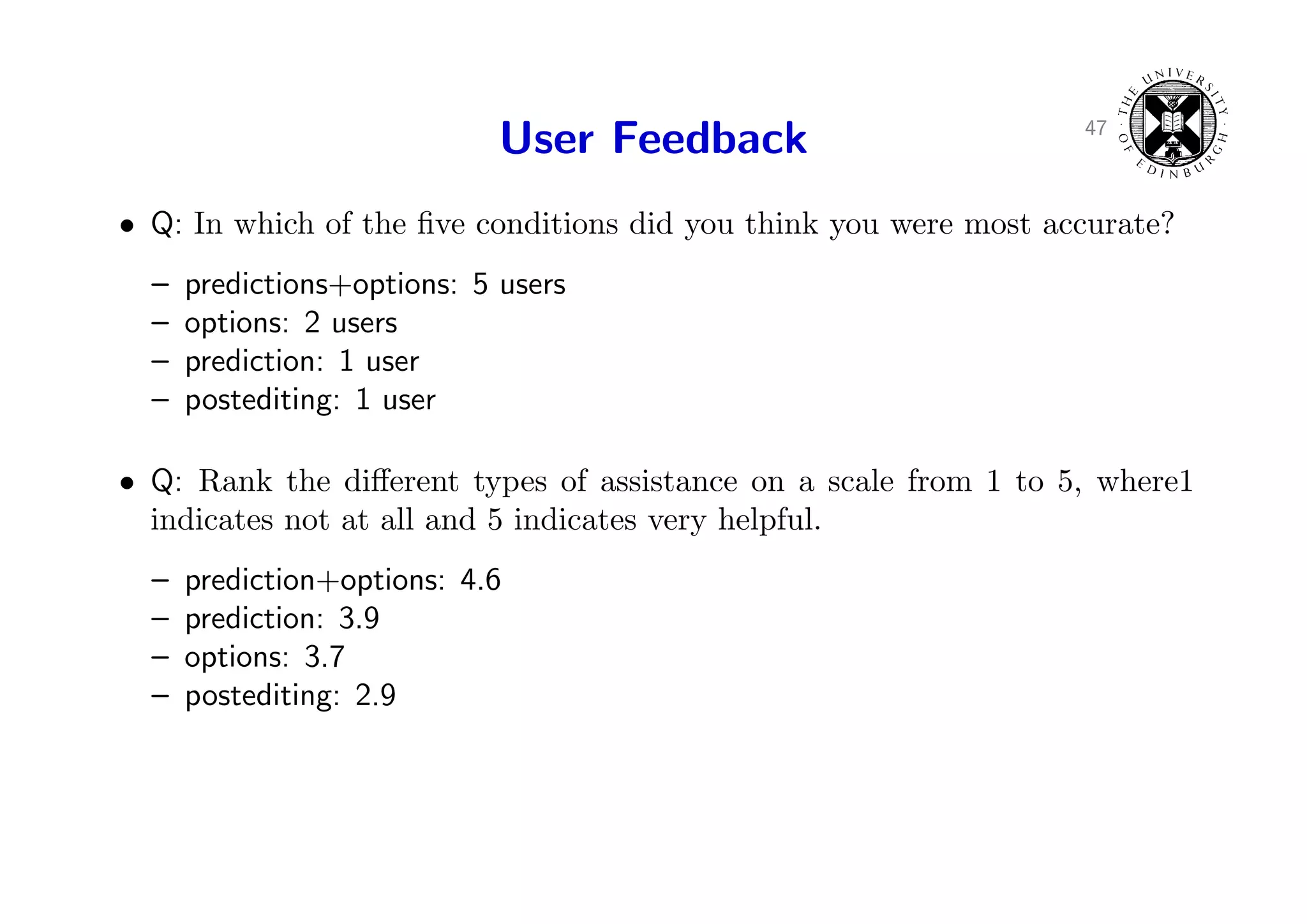 67. 67. 47 User Feedback • Q: In which of the five conditions did you think you were most accurate? – predictions+options: 5 users – options: 2 users – prediction: 1 user – postediting: 1 user