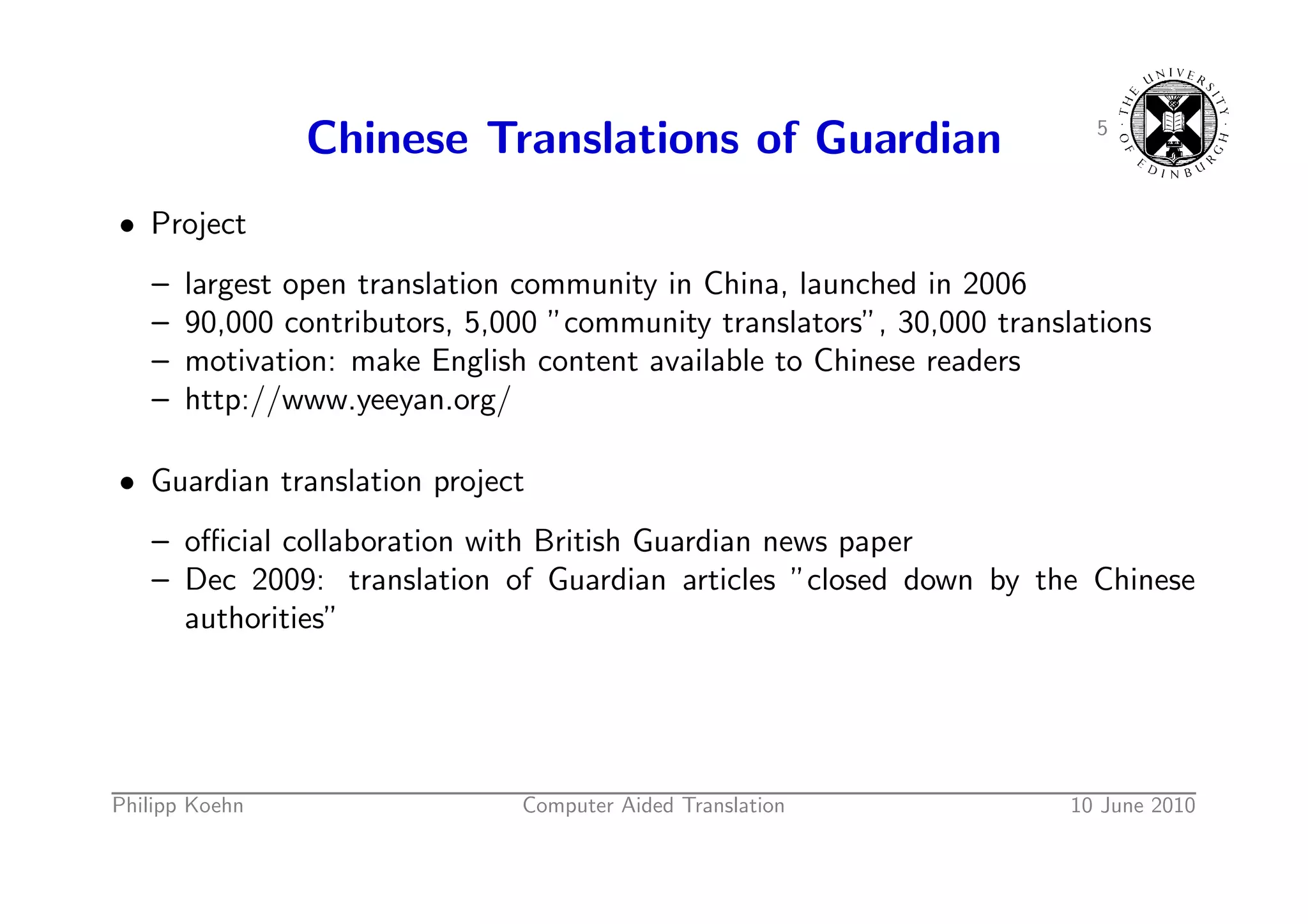7. 7. 5 Chinese Translations of Guardian • Project – largest open translation community in China, launched in 2006 – 90,000 contributors, 5,000 ”community translators”, 30,000 translations – motivation: make English content available to Chinese readers – http://www.yeeyan.org/ • Guardian translation project – official collaboration with British Guardian news paper – Dec 2009: translation of Guardian articles ”closed down by the Chinese authorities” Philipp Koehn Computer Aided Translation 10 June 2010