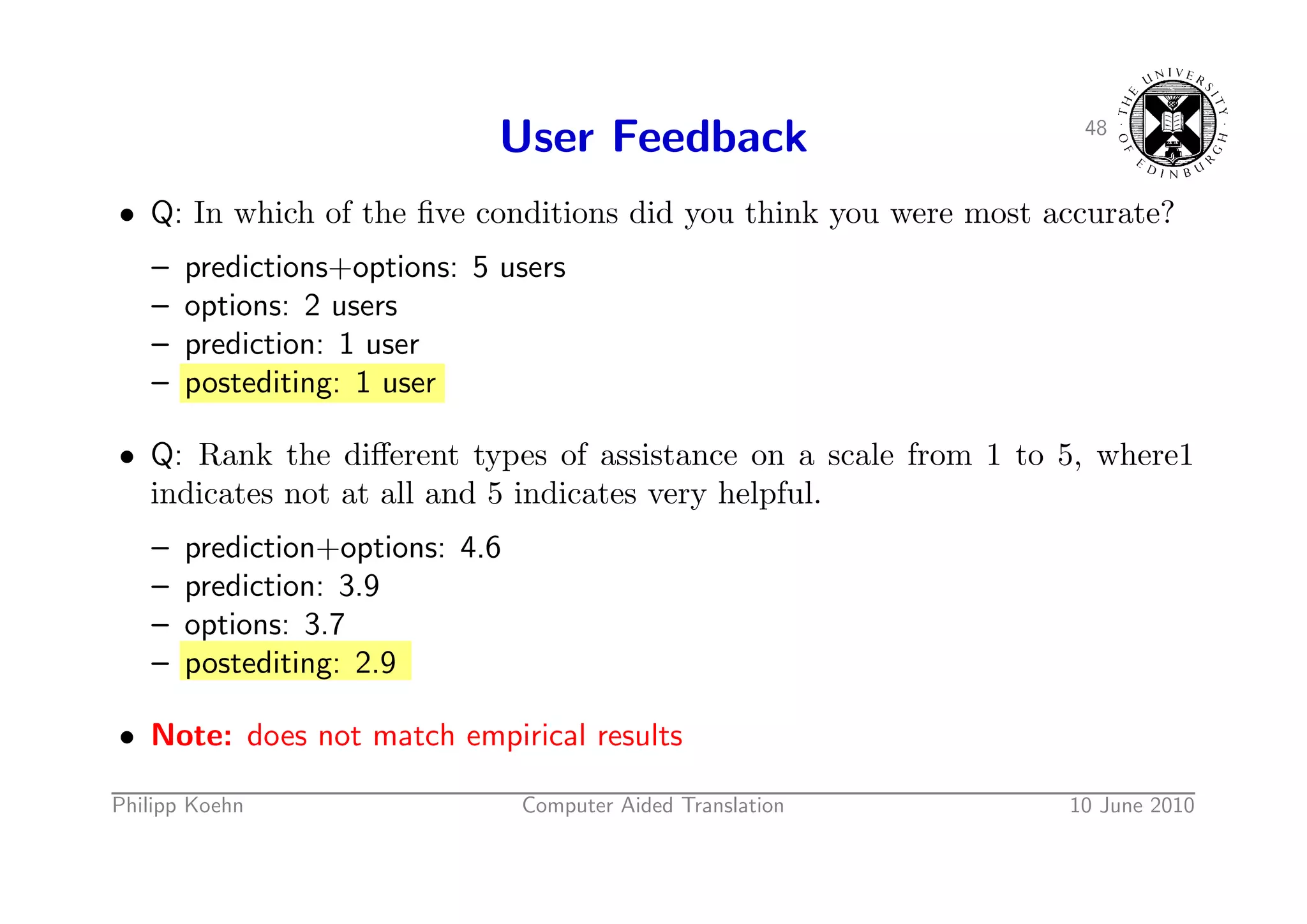 70. 70. User Feedback 48 • Q: In which of the five conditions did you think you were most accurate? – predictions+options: 5 users – options: 2 users – prediction: 1 user – postediting: 1 user • Q: Rank the different types of assistance on a scale from 1 to 5, where1 indicates not at all and 5 indicates very helpful. – prediction+options: 4.6 – prediction: 3.9 – options: 3.7 – postediting: 2.9 • Note: does not match empirical results Philipp Koehn Computer Aided Translation 10 June 2010